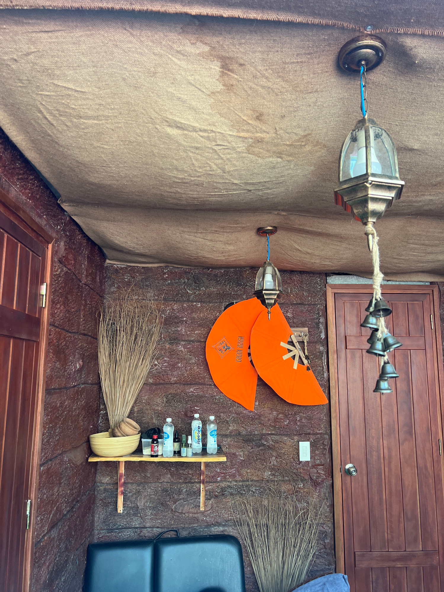 A rustic interior scene in what appears to be the Bac Natural Heritage Area Trang, Vietnam, features a corner of a room with walls covered in textured brown fabric and wood paneling. Two decorative me…read more