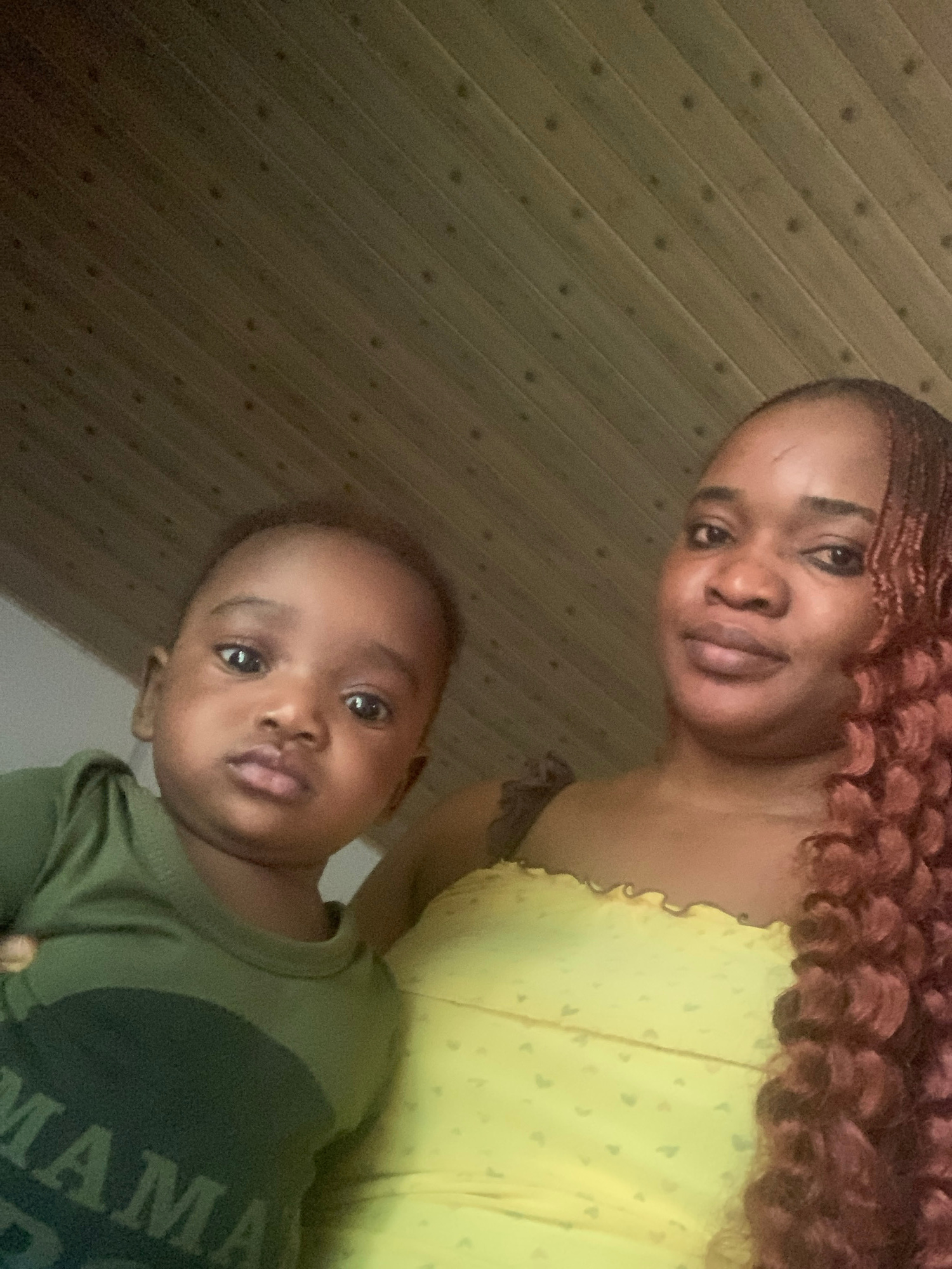 The image shows a woman and a baby. The woman has braided reddish-brown hair, brown skin, and is wearing a yellow top. The baby has brown skin and is wearing a green shirt with the word "MAMA" printed…read more