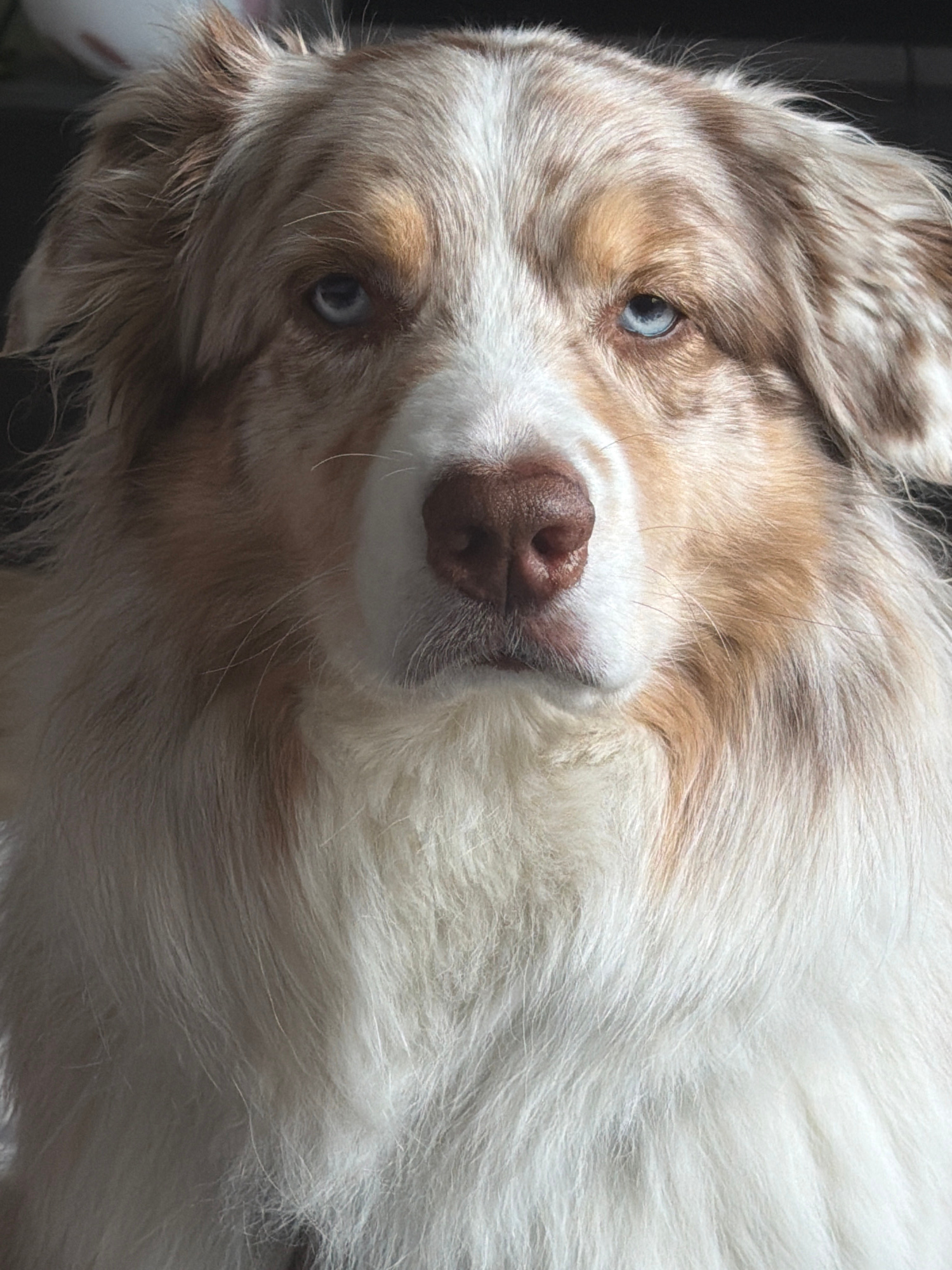 The image shows a close-up of a dog, likely an Australian Shepherd or similar breed, with light-colored fur, brown and white markings, and striking blue eyes. The dog's nose is pinkish-brown and cente…read more