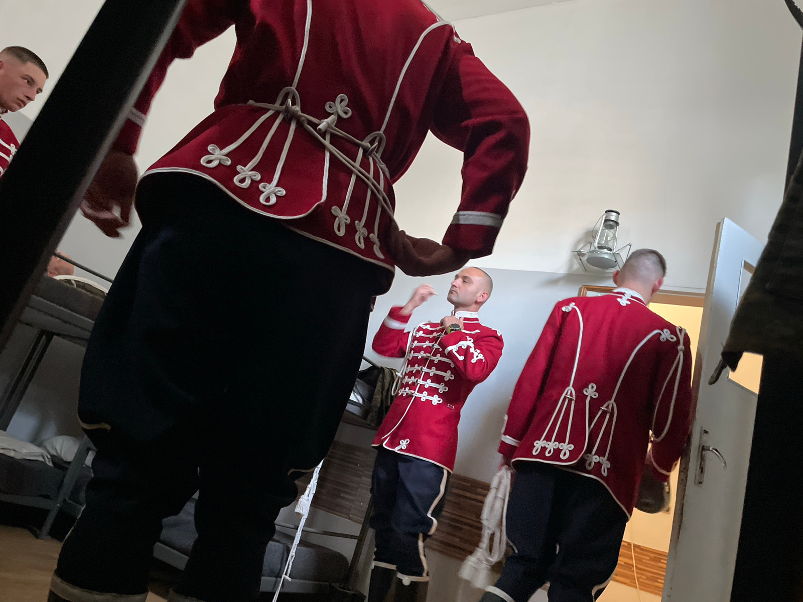 The image captures an indoor scene where several men, dressed in striking ceremonial uniforms, are reflected on a highly polished, light-colored floor. The camera is positioned at a low angle, looking…read more