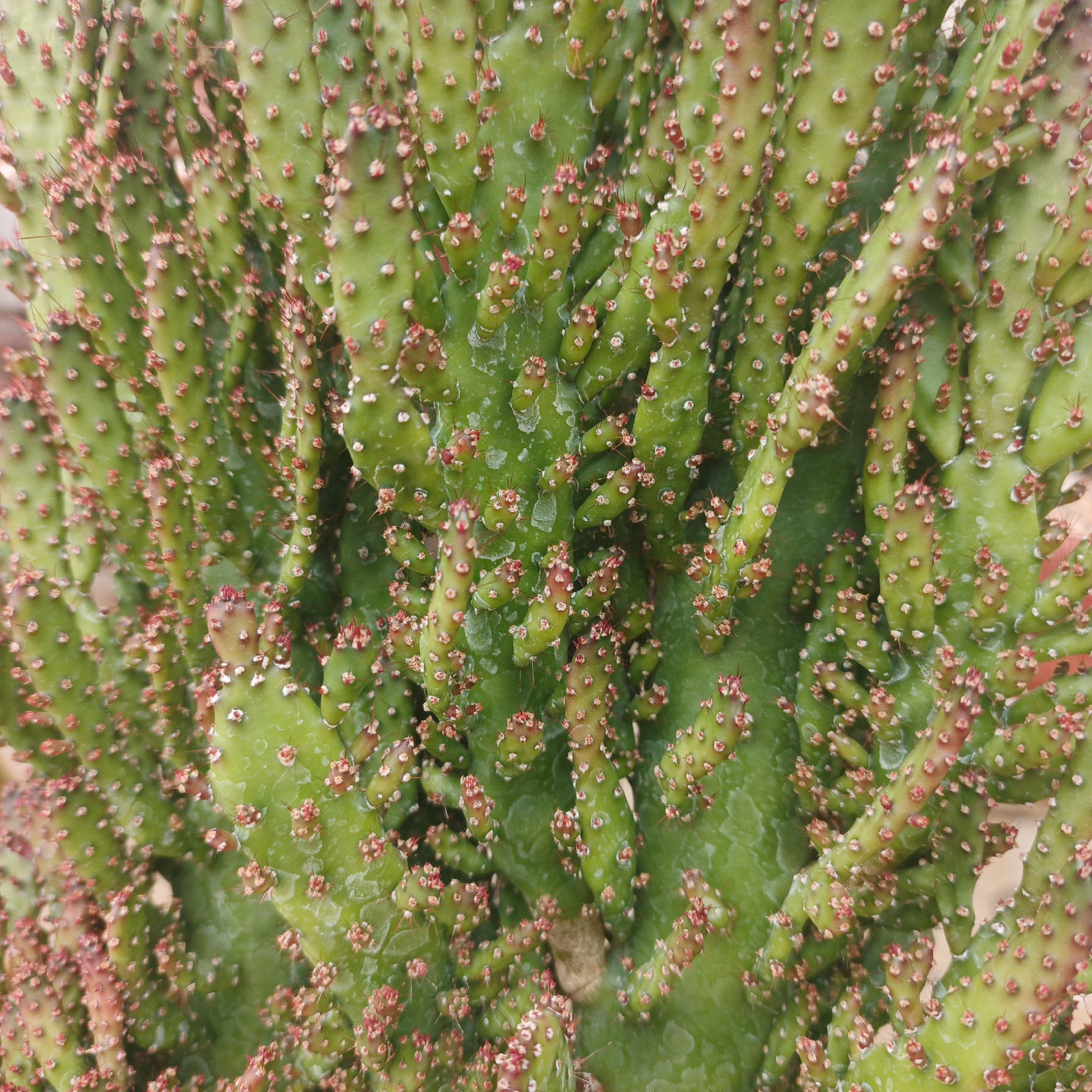 A detailed close-up shot displays a green cactus with numerous small, red-tipped areoles. The cactus appears to have multiple segments or stems densely packed together. The image was captured in Tinaq…read more
