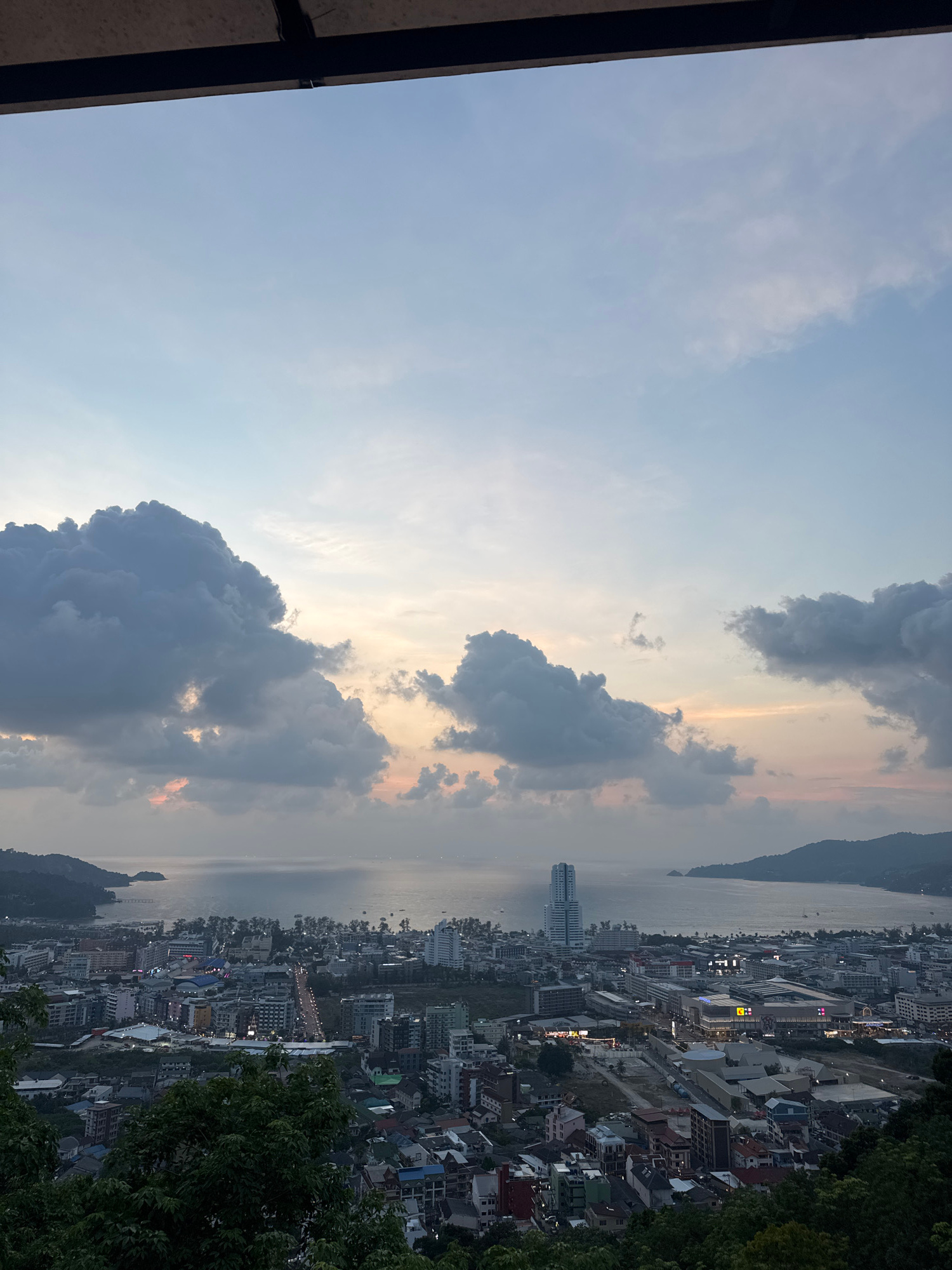 The image presents a panoramic aerial view of Patong, Thailand, captured at dusk from an elevated vantage point. The scene encompasses a dramatic sky, a sprawling coastal city, and the sea stretching…read more