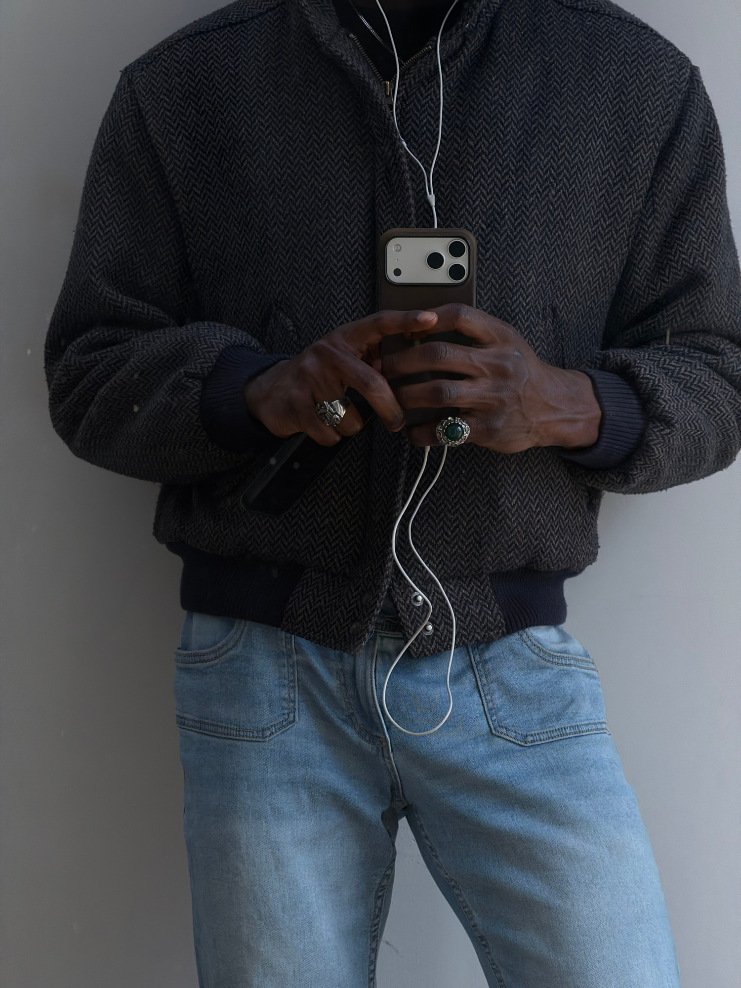 The image shows a person wearing a dark grey jacket with a herringbone pattern, light blue jeans, and two rings. The person's hands are holding a phone with white earbuds connected to it. The backgrou…read more
