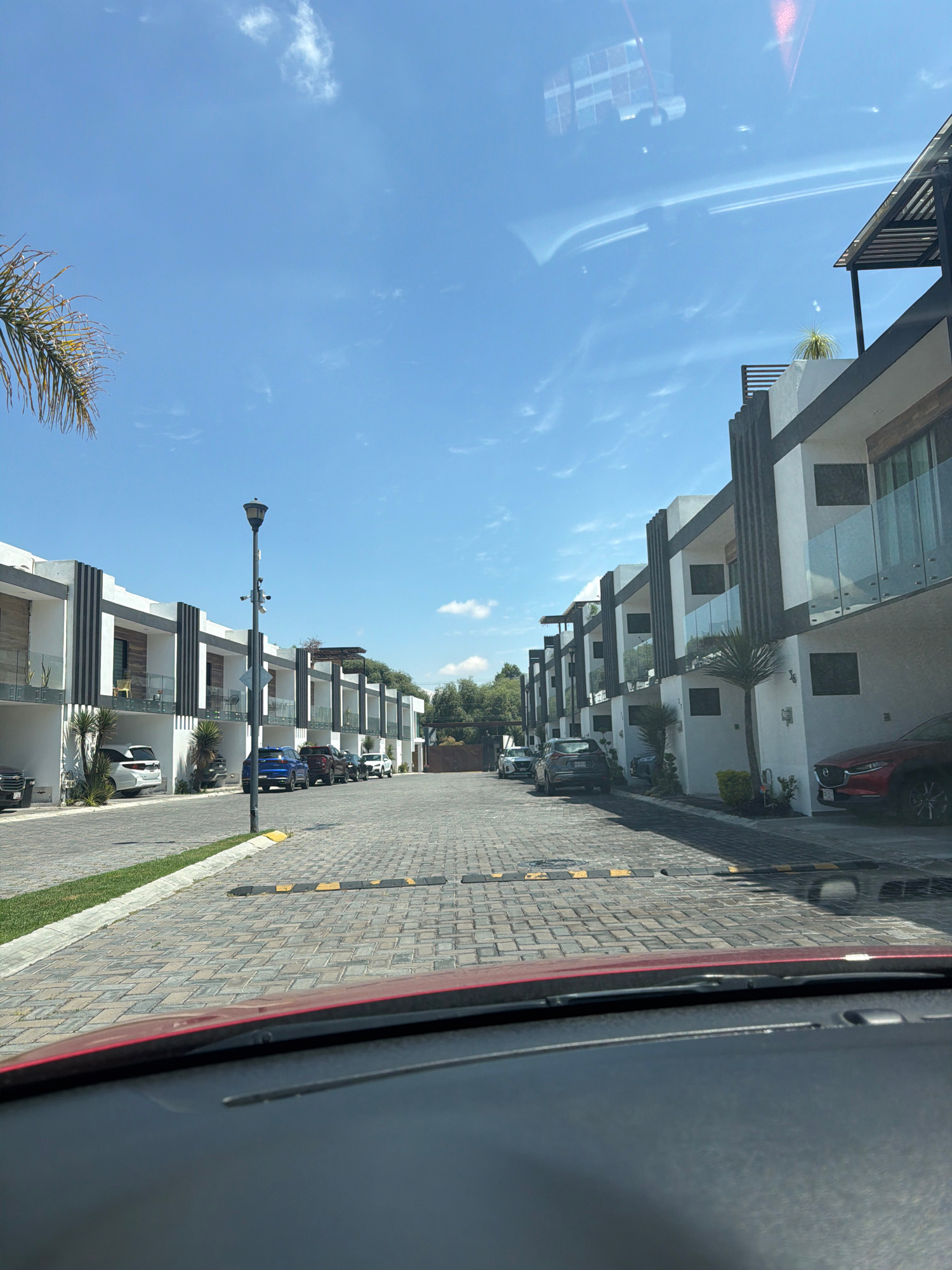 The image depicts a residential street scene in Cholula, Mexico. Modern-style townhouses with white facades and dark gray accents line both sides of the road. The street is paved with light gray brick…read more