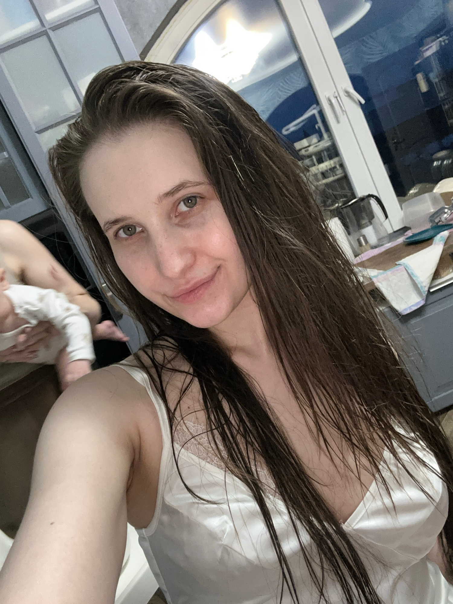A selfie depicts a woman with wet, brown hair and green eyes. She is smiling slightly at the camera and is wearing a white top with lace detailing. She is holding a baby in her arms, who is wearing wh…read more