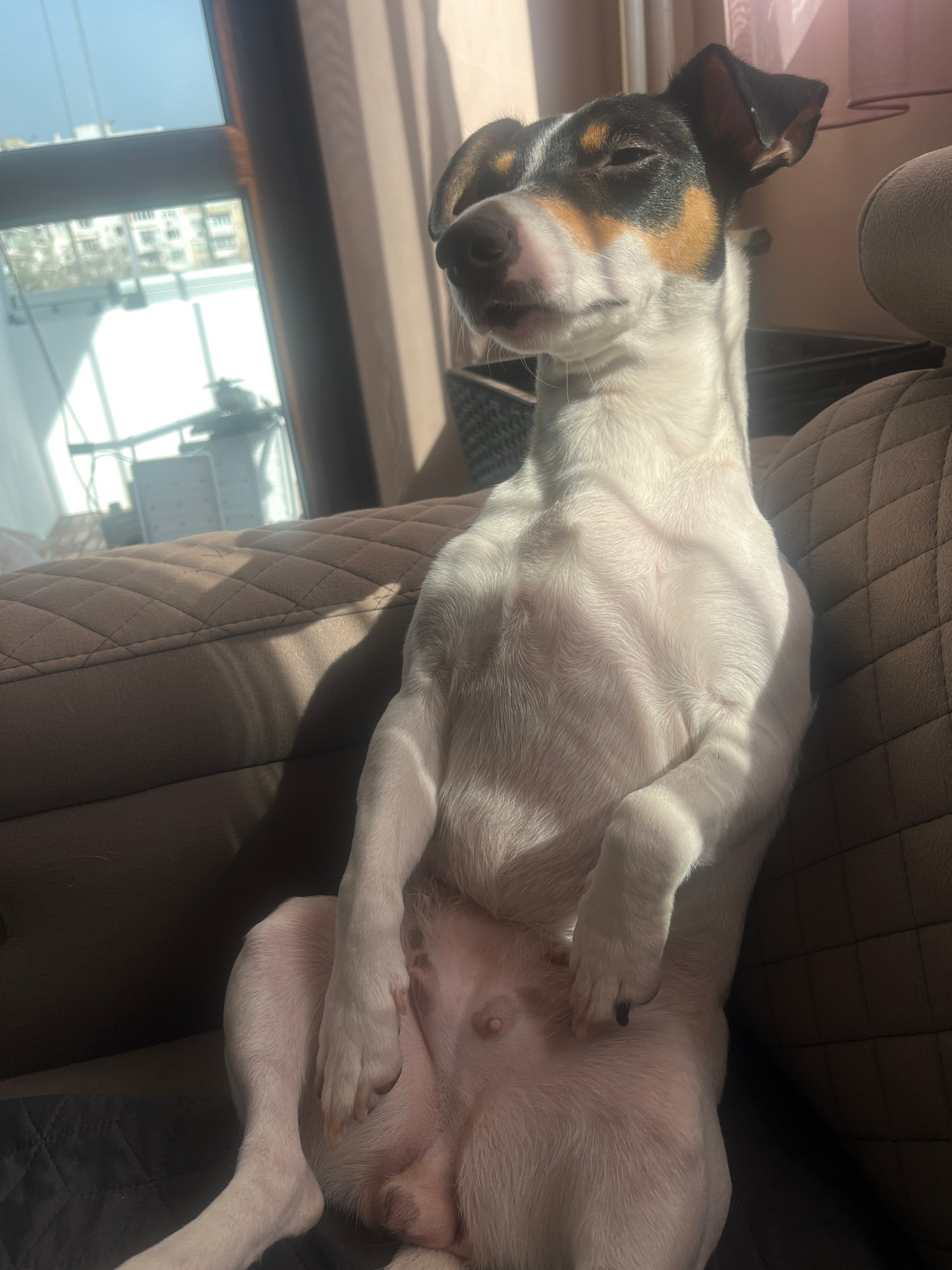 A small dog with a white body and black and tan markings on its head is lying on a brown quilted fabric surface, possibly a sofa or chair. The dog is positioned on its back with its legs in the air. S…read more