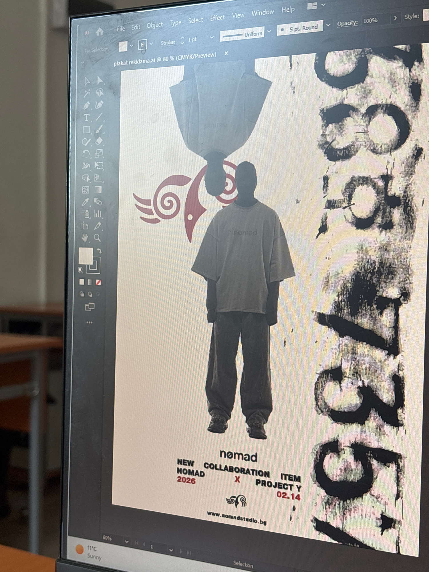 The image shows a computer screen displaying a digital design project in Adobe Illustrator, likely an advertisement poster, given the file name "plakat reklama.ai". The screen is oriented vertically w…read more