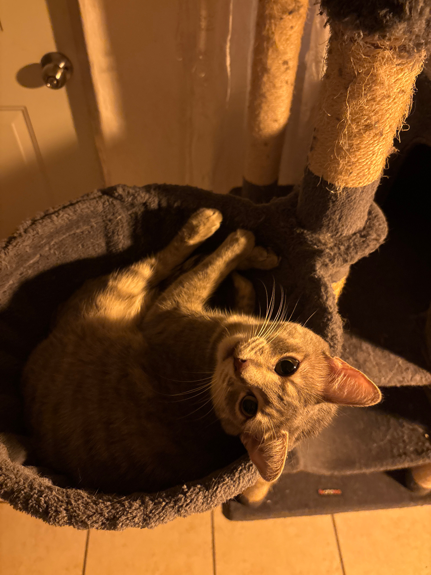 A gray tabby cat lies curled in a gray plush cat tree. The cat is looking directly at the viewer. Part of a scratching post with sisal rope is visible on the left. A door with a silver doorknob and wa…read more