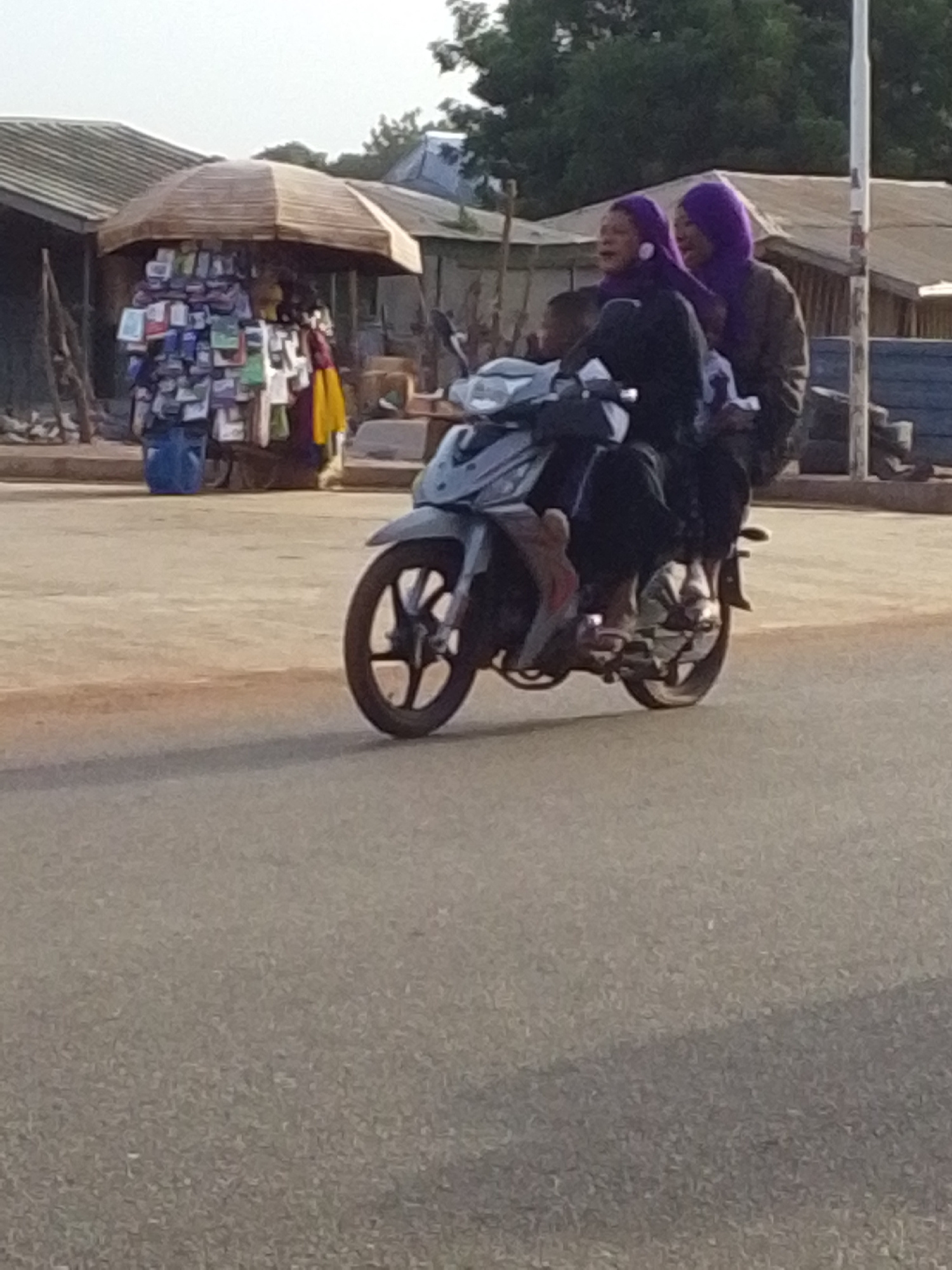 Three people ride a gray motorbike along a paved street in Tamale, Ghana. The driver, wearing a black outfit and purple headscarf, appears to be shouting. Behind them is a passenger wearing a dark jac…read more