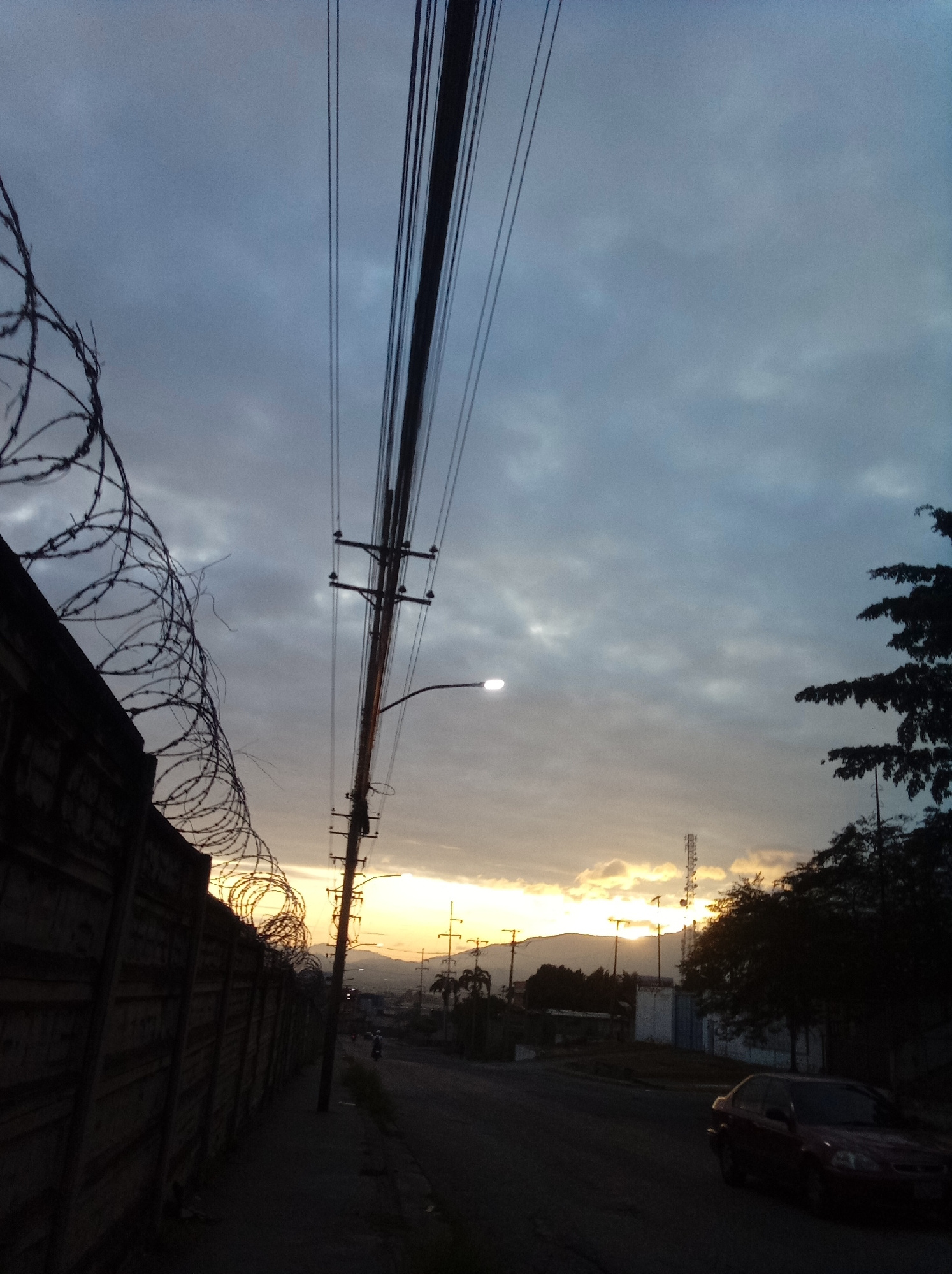 The image depicts a street scene at dusk in Parroquia Guatire, Venezuela. The location appears to be on the periphery of the city, evidenced by a wall topped with barbed wire on the left, running para…read more