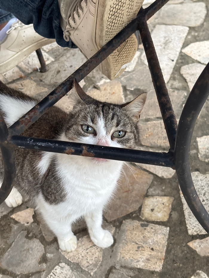 A cat lies on a stone-paved surface, viewed from above through black metal bars. The cat is predominantly white with gray tabby markings on its head and back. It has striking green eyes and an inquisi…read more