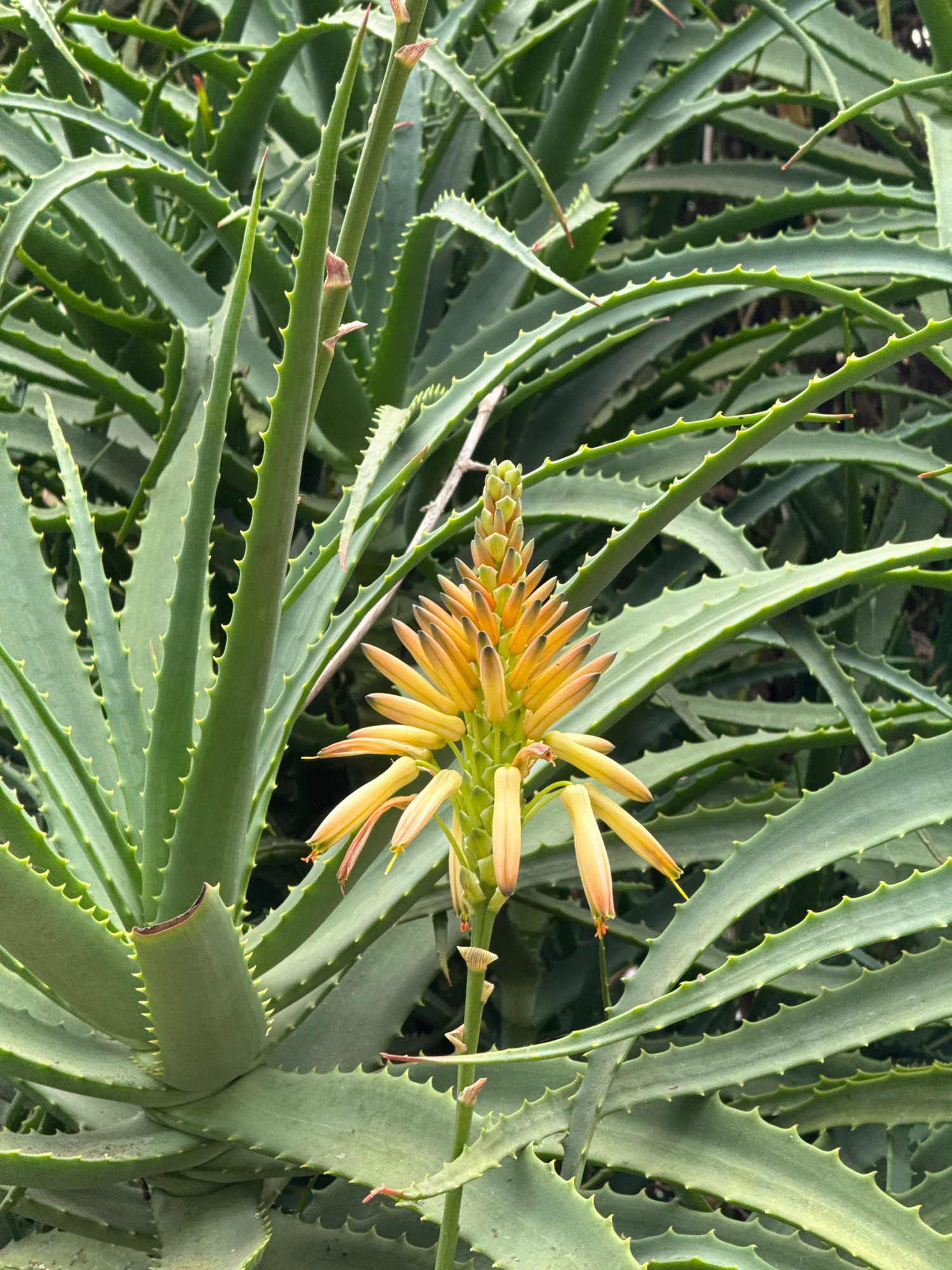 The image depicts a cluster of Aloe vera plants in bloom. The fleshy, lance-shaped leaves are green and feature serrated edges with small, yellow teeth. A central flower stalk emerges, adorned with cl…read more