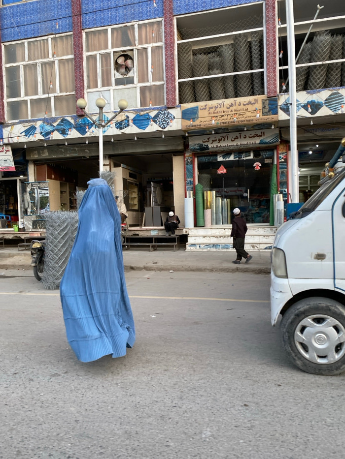 The image displays a commercial street scene in Kandahar, Afghanistan, under overcast conditions. In the immediate foreground, a person dressed in a floor-length, pleated blue burqa walks left on a gr…read more
