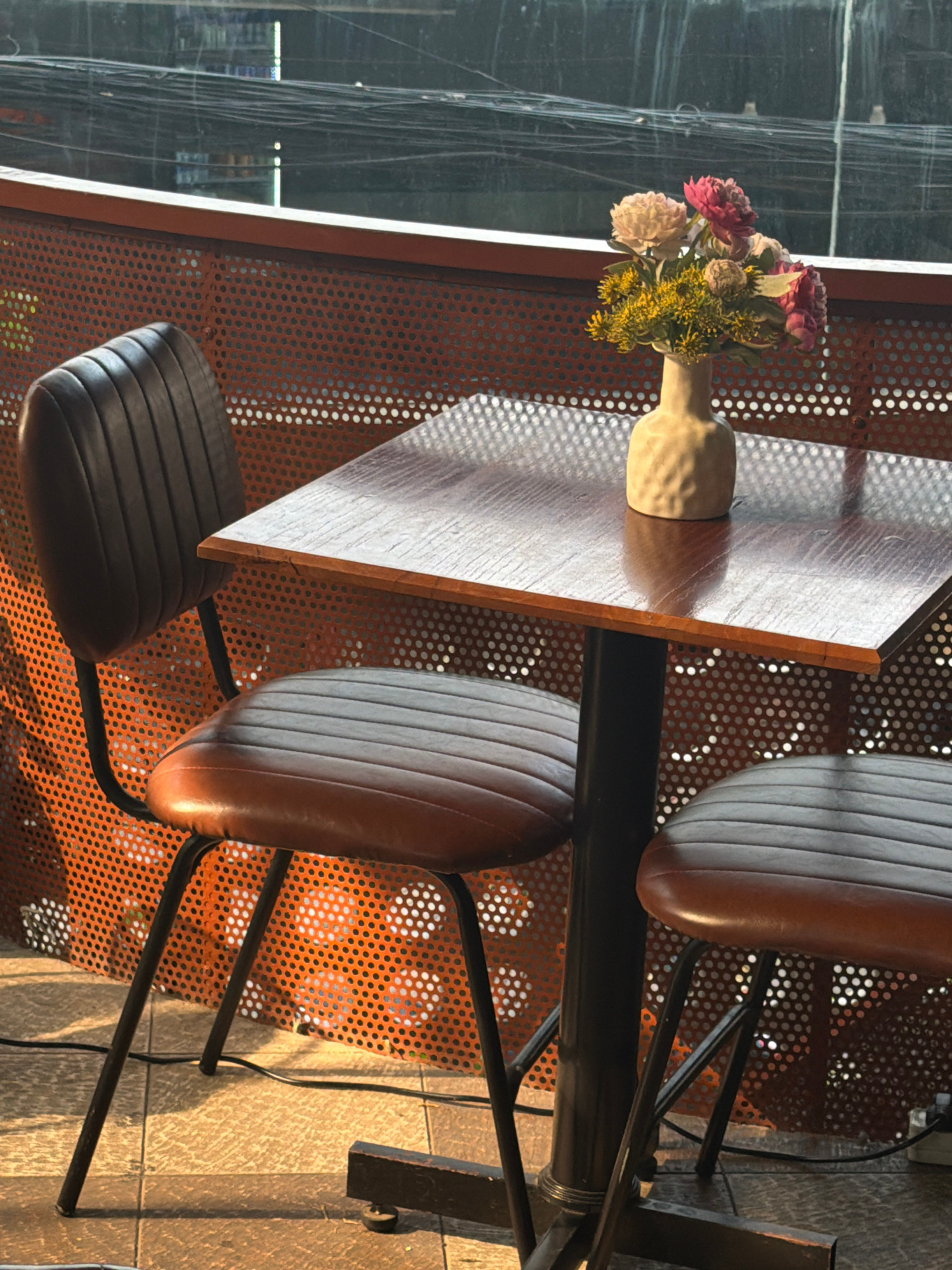 The image displays a static scene within what appears to be a modern cafe or restaurant setting in Đà Nẵng, Vietnam. The central focus is a wooden-topped table with a dark metal base, accompanied by t…read more
