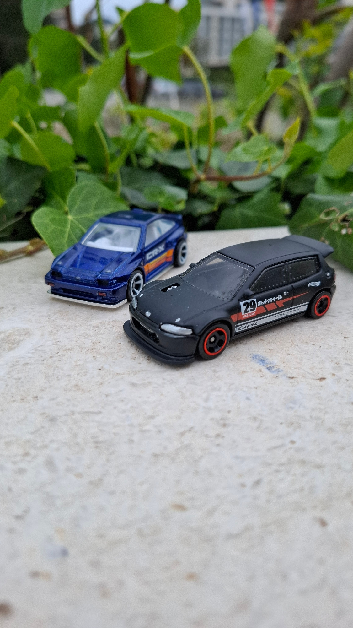 Two toy cars, a blue CRX and a black Honda Civic, rest on a light-colored concrete surface. A green ivy-like plant is situated to the left of the cars. The location appears to be outdoors, with blurre…read more