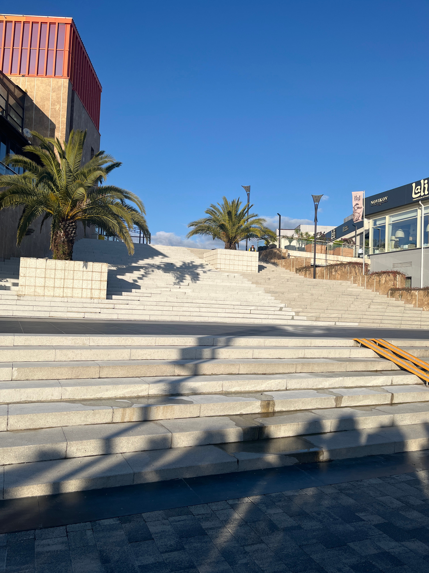 The image depicts an outdoor scene in what appears to be a modern urban area. The scene is set in Sochi, Russia based on visible storefront signage. There are steps leading uphill from a plaza made of…read more