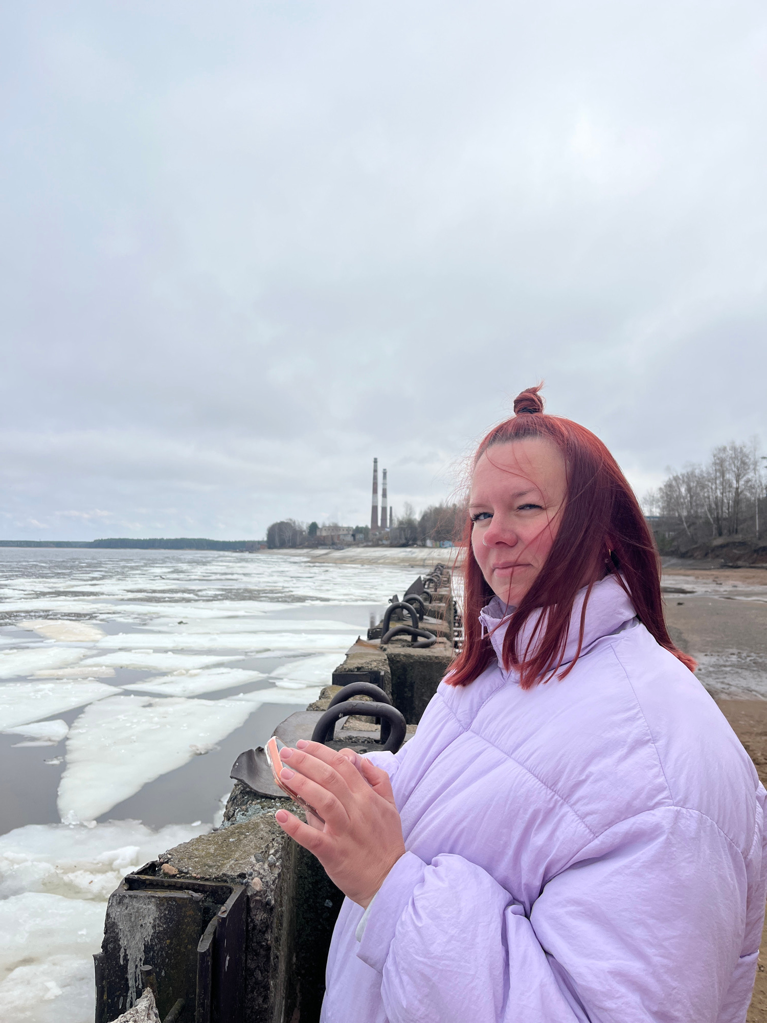 A young woman with reddish-brown hair is standing next to a concrete pier in Chaikovsky, Russia. She is wearing a light purple puffer jacket and has her hair tied up in a bun. The river is covered inβ¦read more