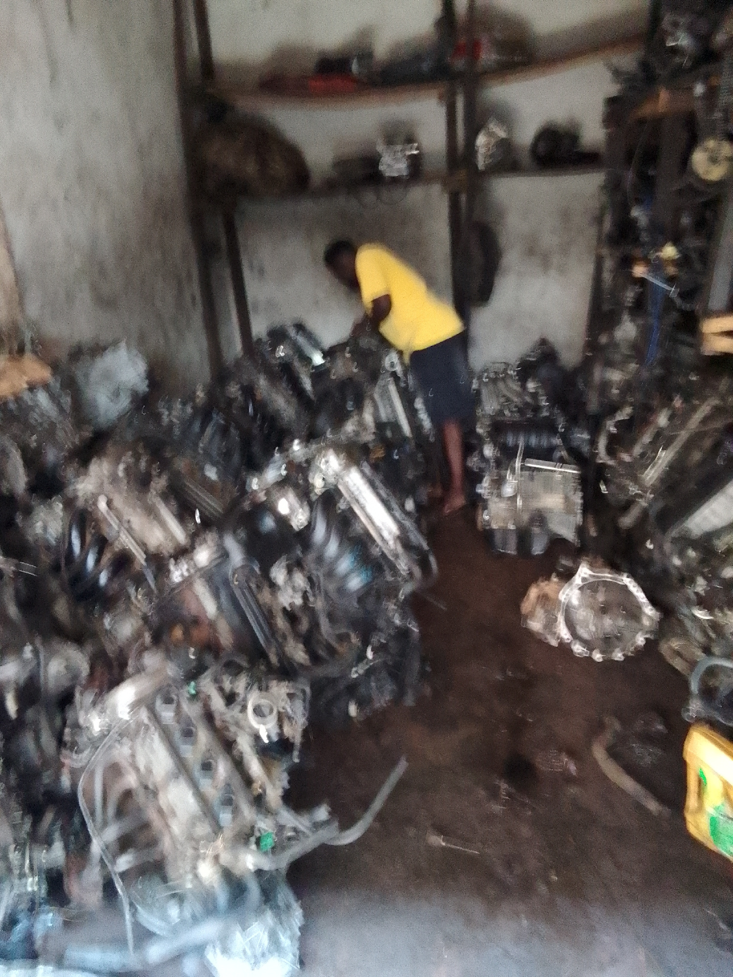 This image depicts an indoor scene, likely a workshop or storage facility for salvaged automobile parts in Onitsha, Nigeria. The central focus is a person, appearing to be male, wearing a bright yello…read more