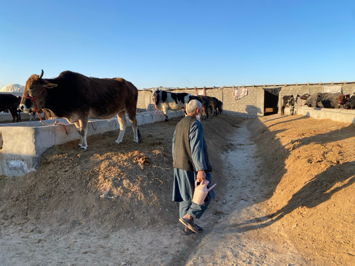 The image depicts an outdoor cattle pen in Jabadar, Afghanistan, under a clear, bright blue sky during what appears to be late afternoon or early morning, evidenced by long shadows. In the foreground-…read more