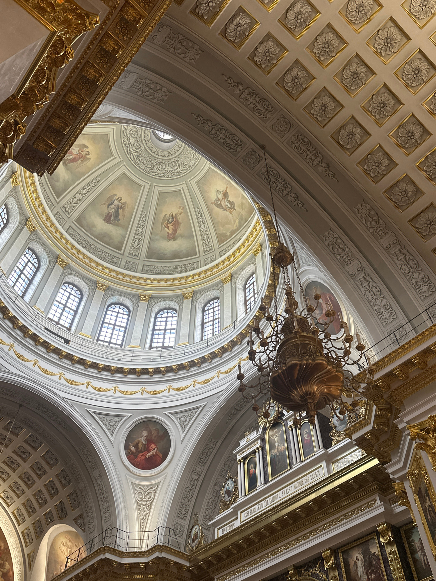 The image captures the interior of a grand religious building, likely a cathedral, in Kazan, Russia. The camera is pointed upwards, showcasing the elaborate ceiling and dome architecture. The ceiling…read more