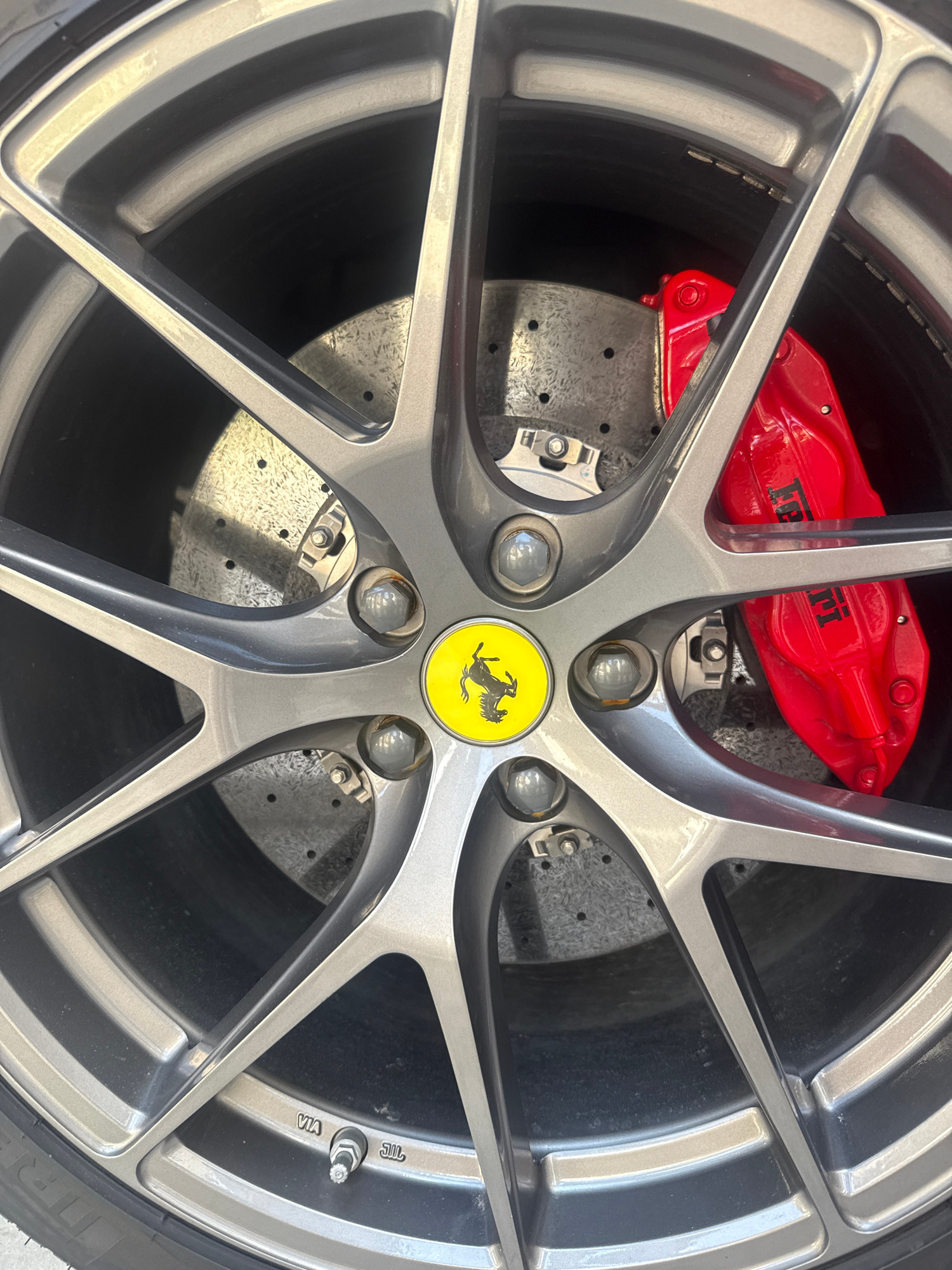 The image shows a close-up of a Ferrari car wheel. The wheel has a silver-grey rim with a yellow center cap featuring the Ferrari logo of a prancing horse. Behind the wheel spokes, a red brake caliper…read more