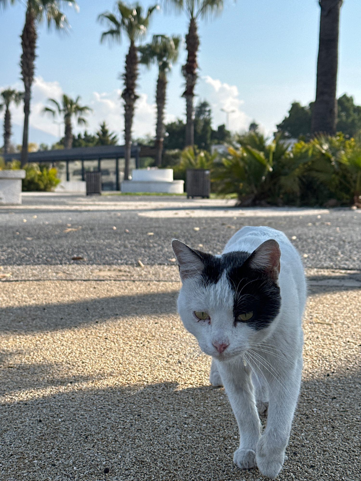 A black and white cat walks towards the viewer on a light-colored gravel path in an urban park setting in Fethiye, Turkey. The cat has white fur with a prominent black patch covering its right eye and…read more