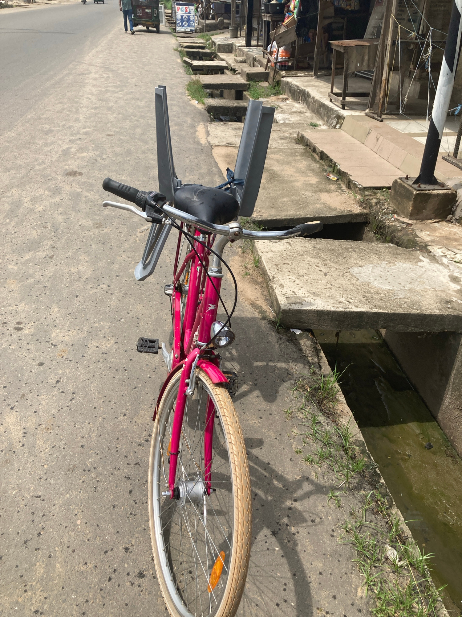 A pink bicycle rests on a paved surface alongside a concrete drainage ditch filled with water. The scene is urban, with buildings and structures visible in the background, suggestive of a city street.…read more