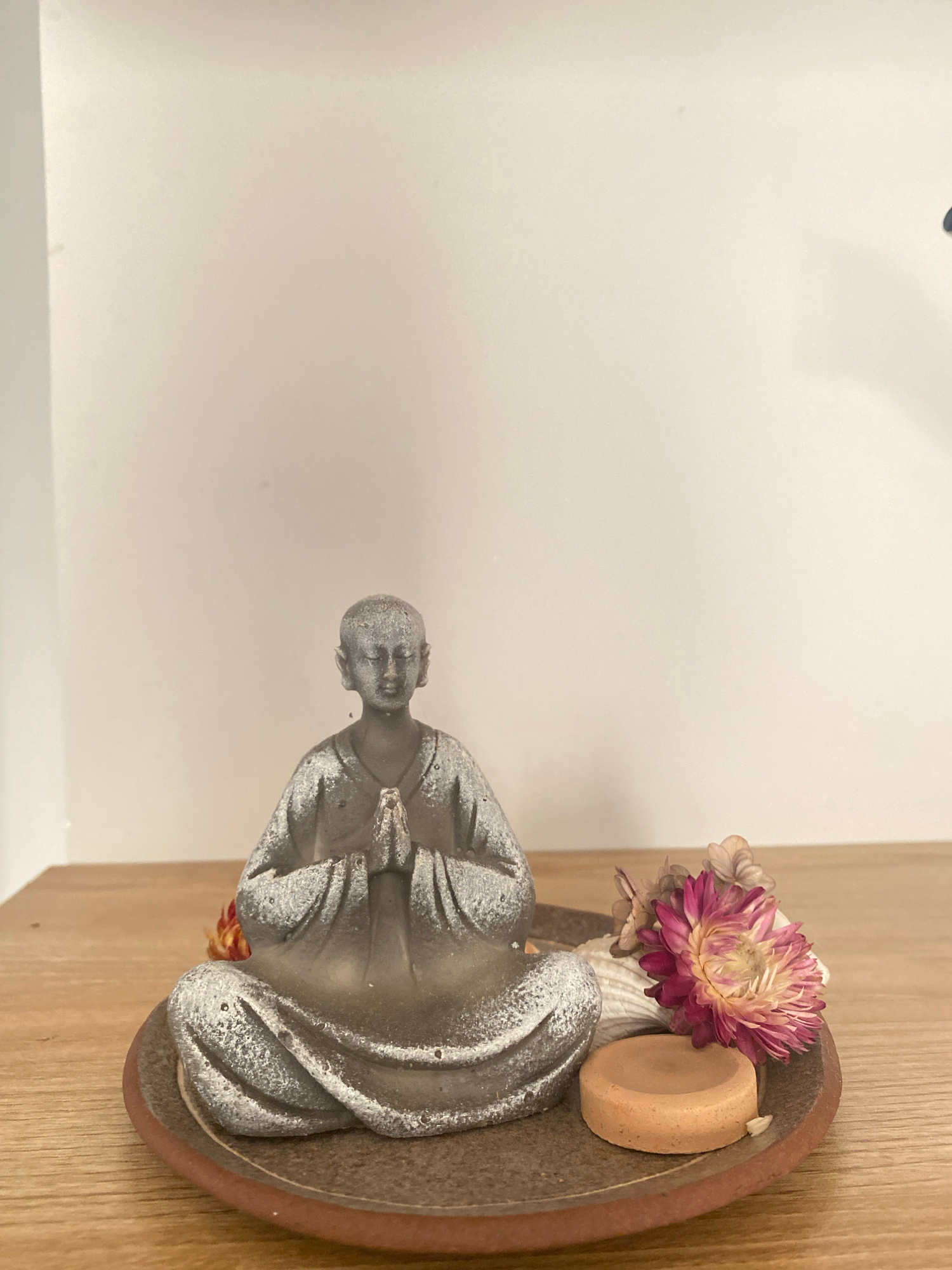A statue of a person in a meditative pose, possibly a monk or spiritual figure, is placed on a wooden surface near a white wall. The statue has a textured, possibly stone-like appearance, and is posit…read more