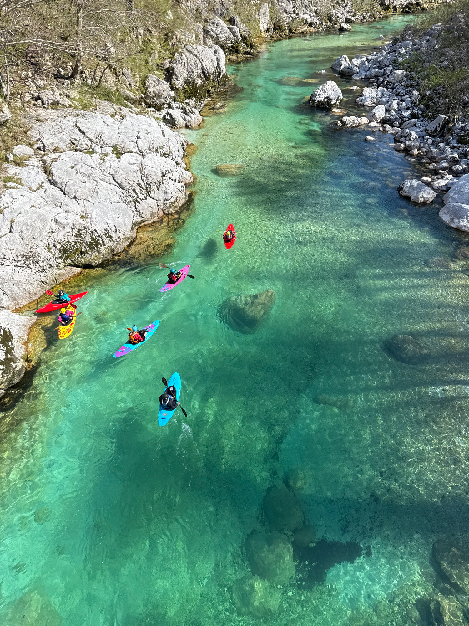 The image is a top-down view of a river near Kobarid, Slovenia, where five kayakers are navigating its turquoise waters. The river is bordered by rocky banks covered with large boulders and sparse veg…read more