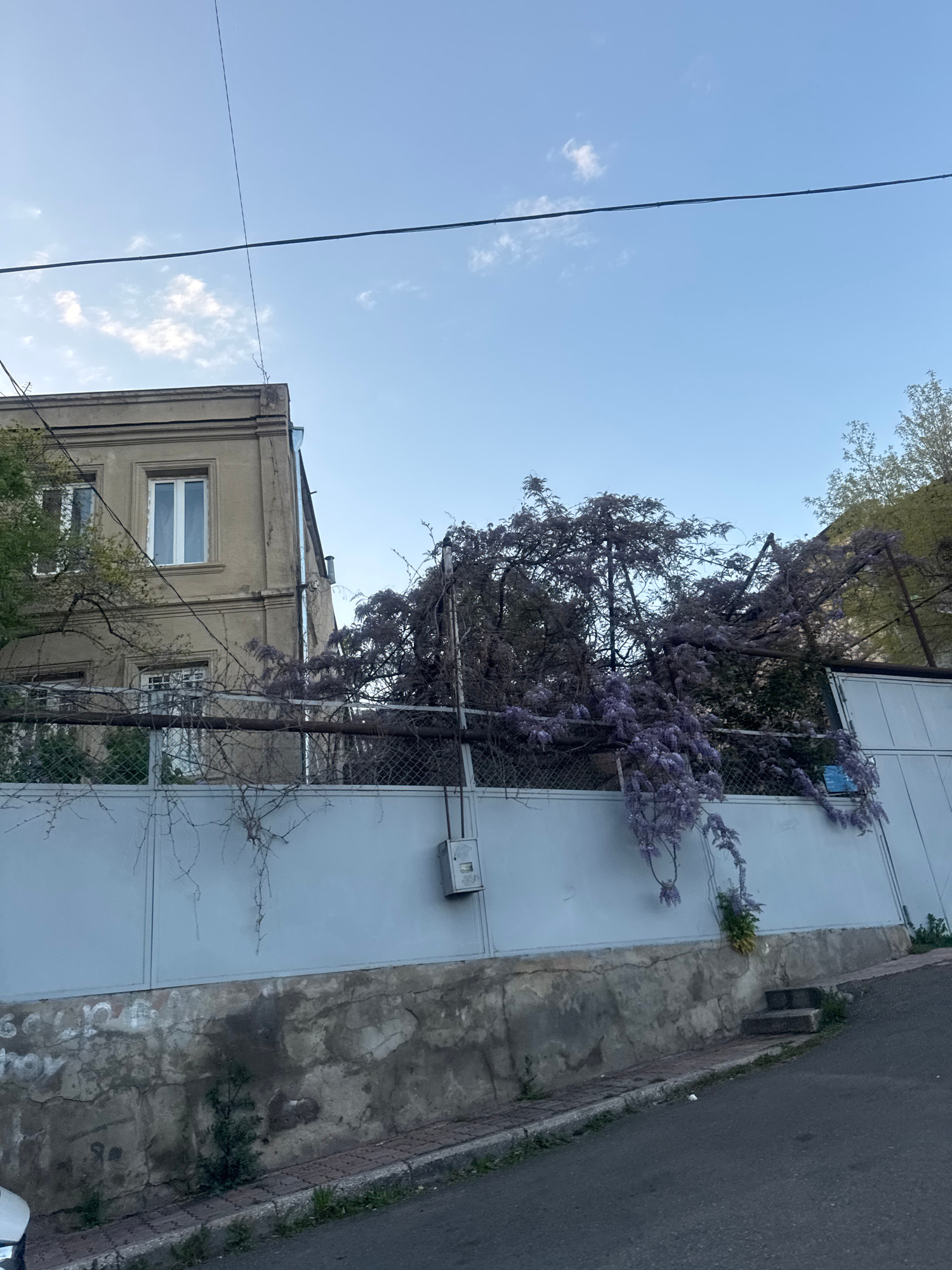 The image captures an outdoor scene featuring an old building, a flowering wisteria vine, and a street under a bright sky. The original image is rotated 90 degrees counter-clockwise; when upright, the…read more