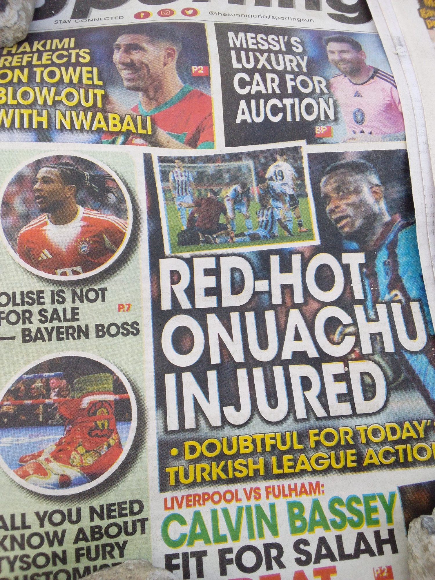 The image shows a newspaper page, likely from Lagos, Nigeria, given the domain "@thesunnigeria" visible at the top. The page features several sports-related articles. Headlines include: "HAKIMI REFLE…read more