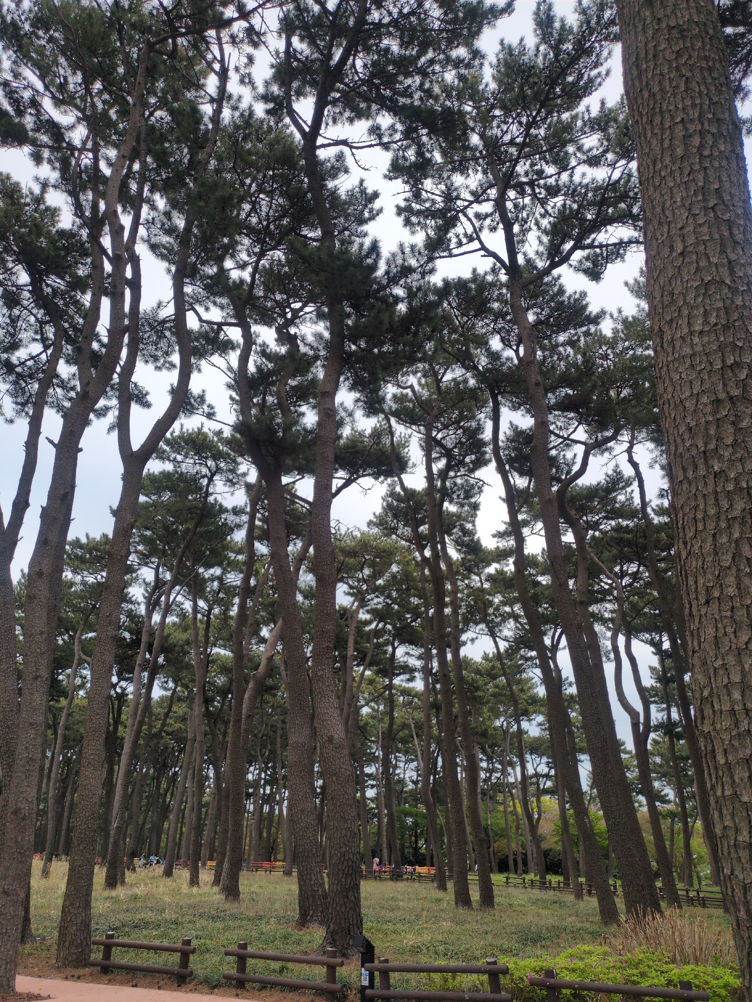 This image captures a serene outdoor scene, likely a park or arboretum, in Ulsan, South Korea, dominated by a long, straight avenue of mature pine trees. The perspective looks along the path, with the…read more