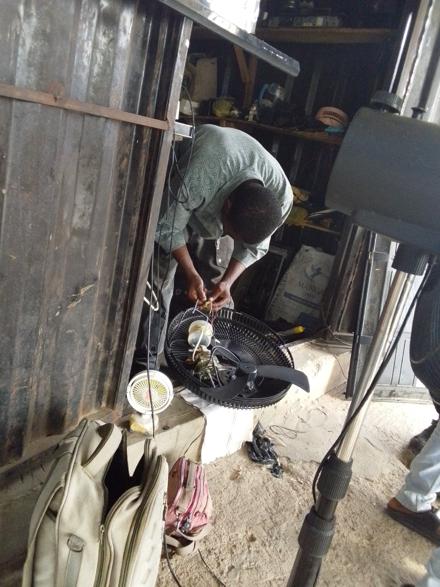 In Lokoja, Nigeria, a man is repairing a fan inside a corrugated metal structure with an open doorway. The man wears a patterned shirt and dark pants, focused on the fan in front of him. The fan is bl…read more