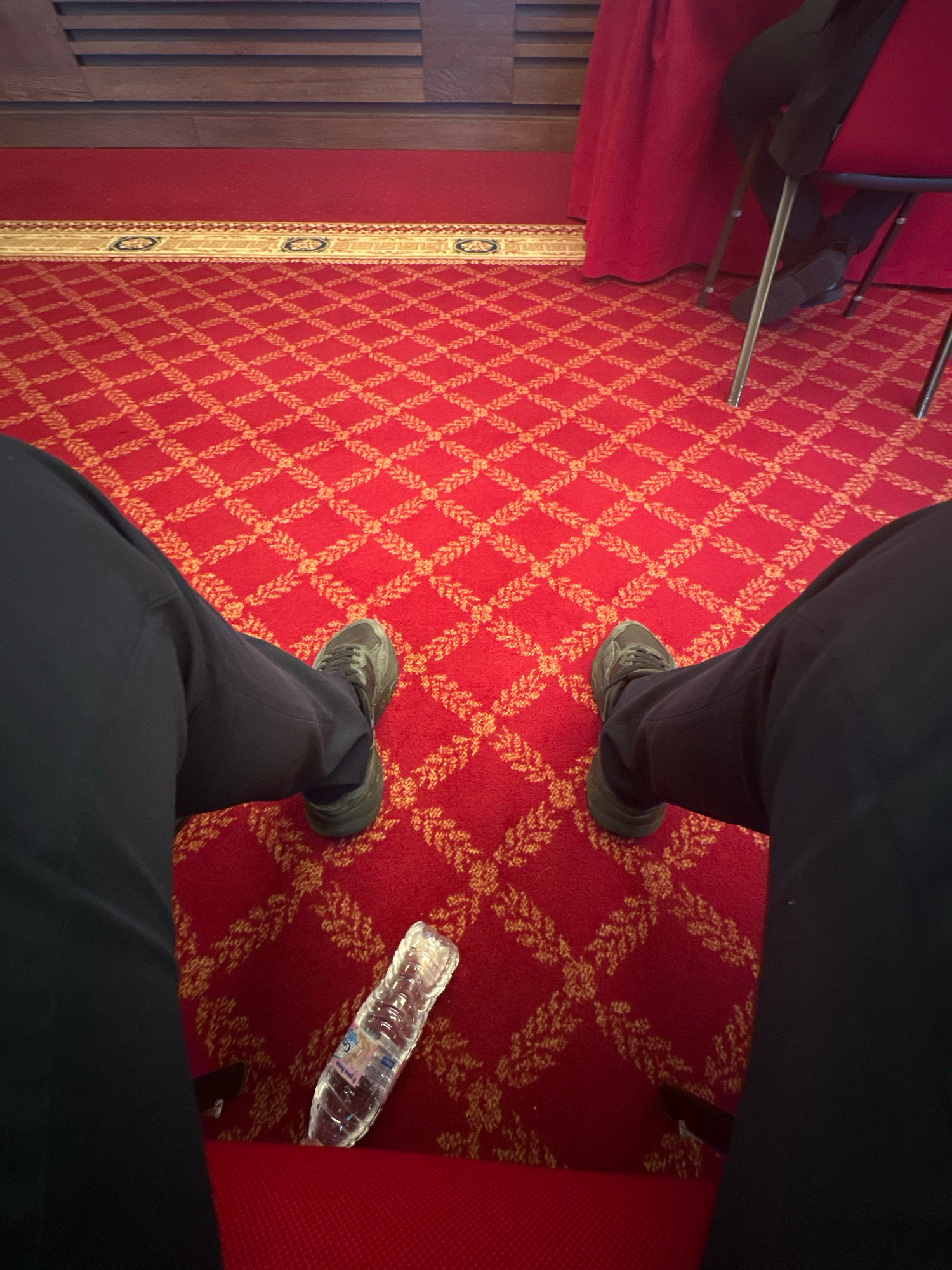 The image shows a downward-angled view of a red and gold patterned carpet in what appears to be an interior space. Two pairs of feet, wearing dark grey or olive-colored sneakers and dark trousers, are…read more