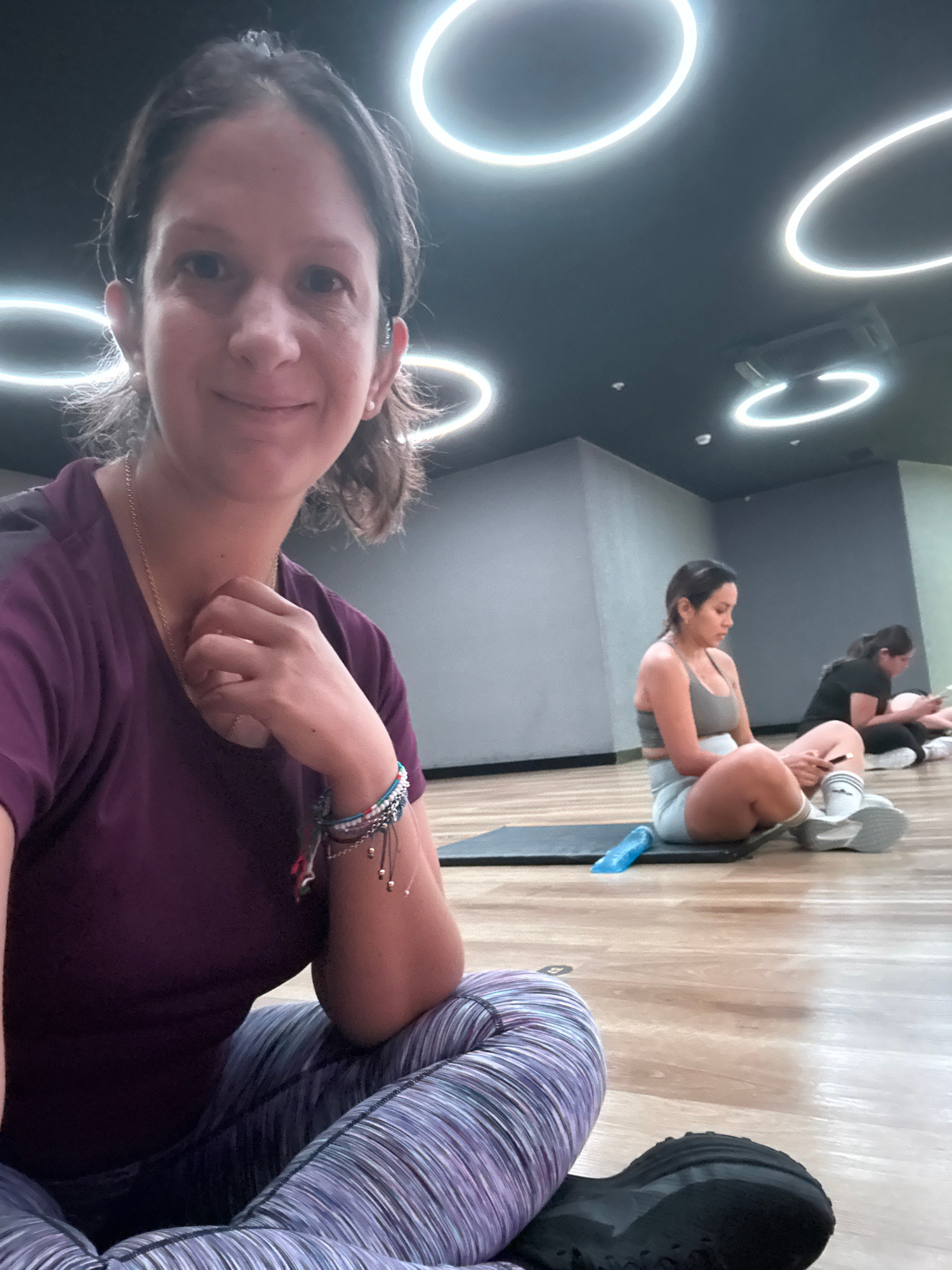 This full-shot selfie captures a woman with a slight smile, positioned at a low angle, looking towards the camera. She wears a purple t-shirt, patterned purple and white athletic leggings, and dark sn…read more