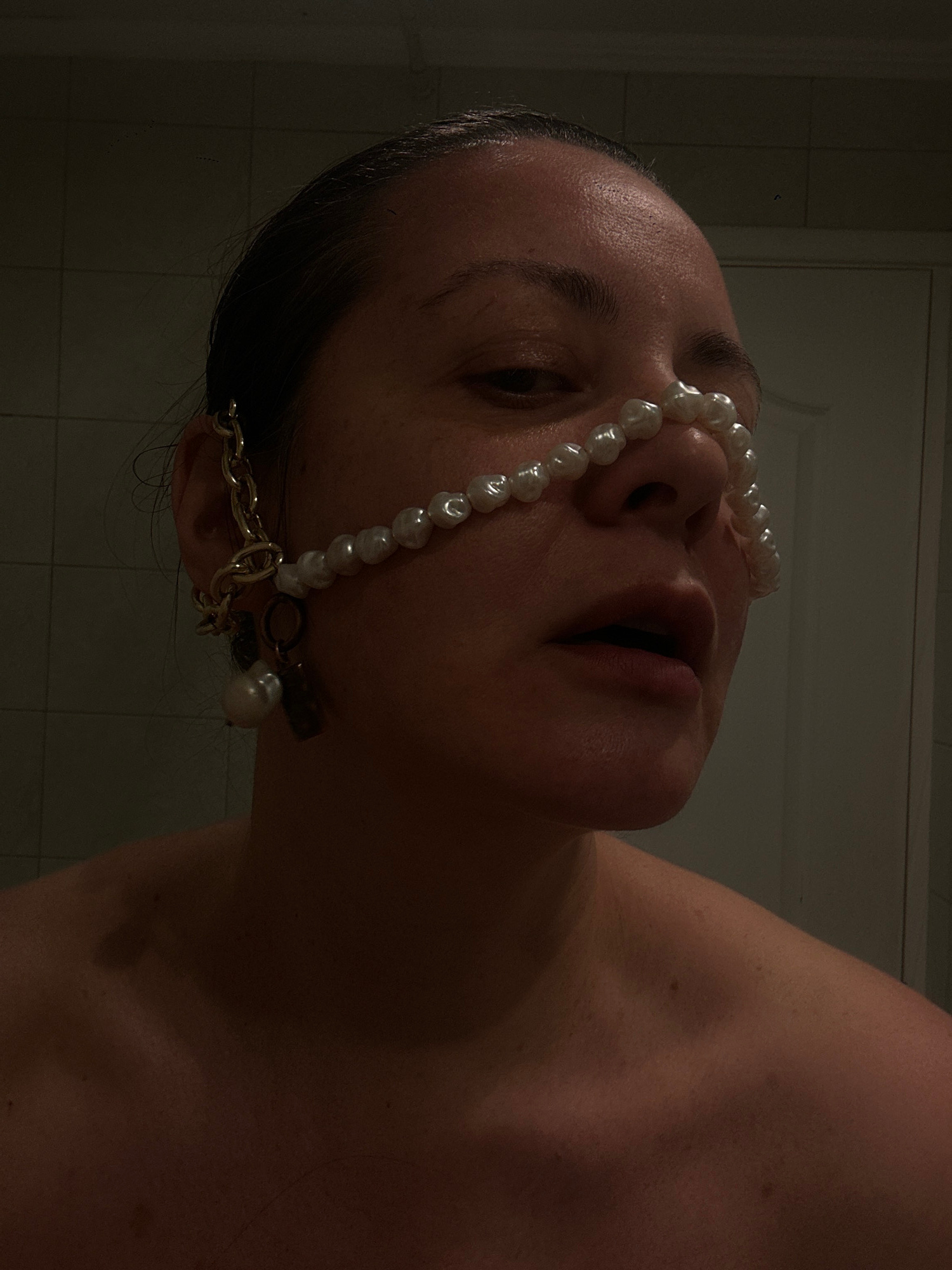 A close-up, low-angle shot shows a person's face and upper torso against a tiled background. The person has dark hair pulled back, exposing a forehead and skin with visible pores and freckles. The perβ¦read more