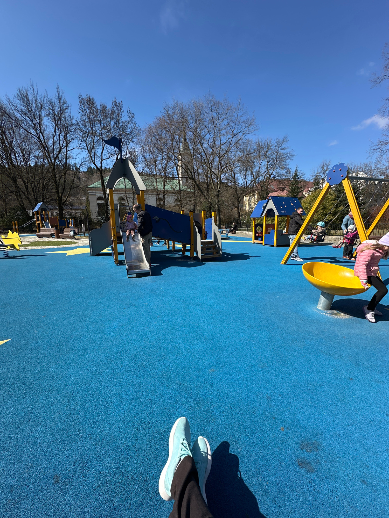 The image depicts a playground on a bright, sunny day in Wisła, Poland. Dominating the foreground is a blue, textured rubber surface. In the distance, various playground structures are visible, includ…read more