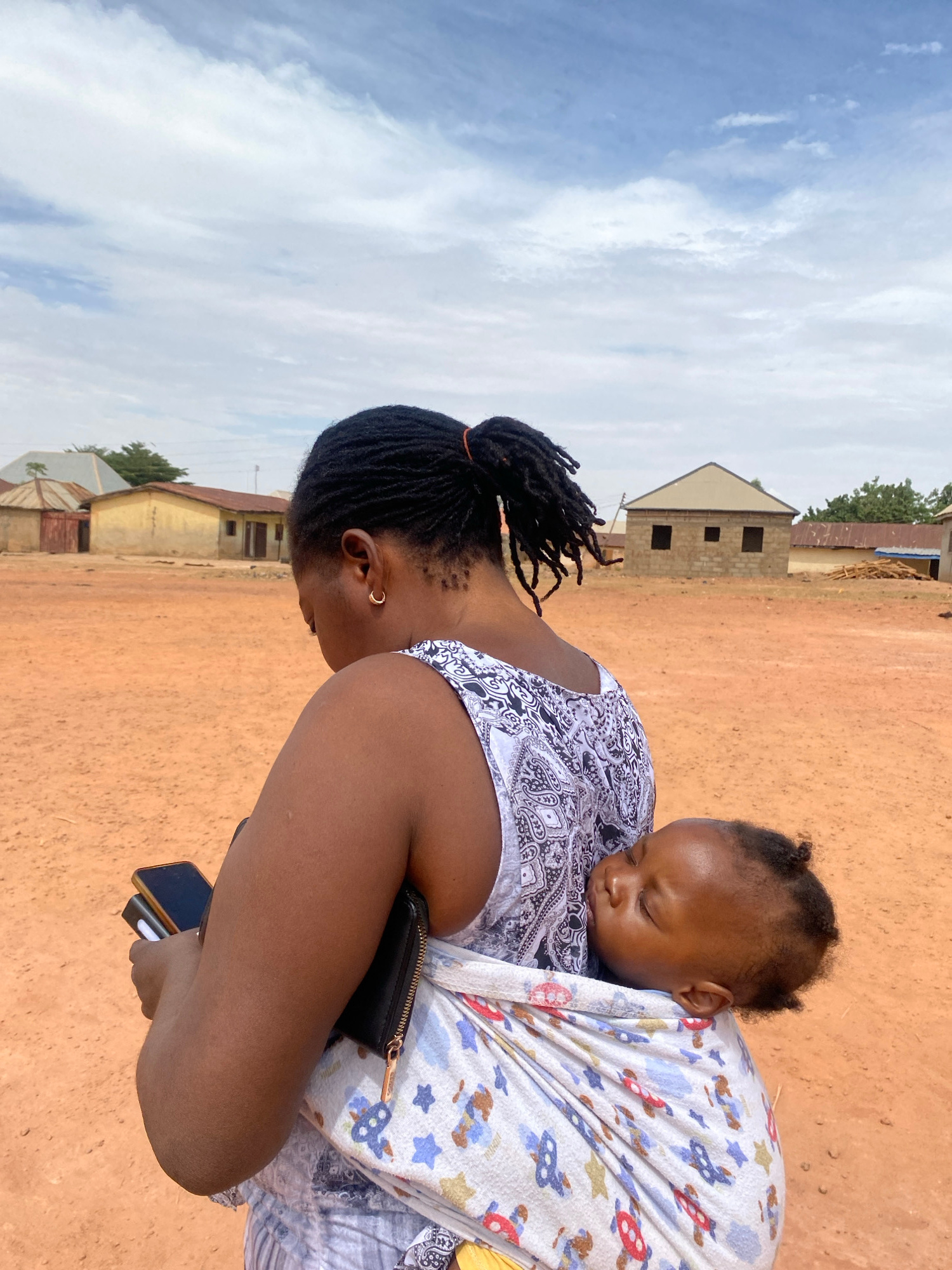 In an outdoor setting in Rido, Nigeria, a Black woman with braided hair tied back with a red tie is carrying a sleeping baby secured in a printed white and blue sling. The woman wears a white and blac…read more