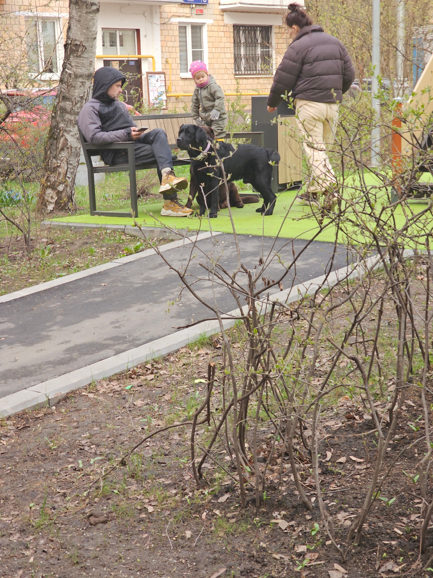 This rotated image captures an outdoor scene, likely a residential courtyard or park area, during early spring. A paved pathway runs through the middle, flanked by a bright green, possibly painted, gr…read more