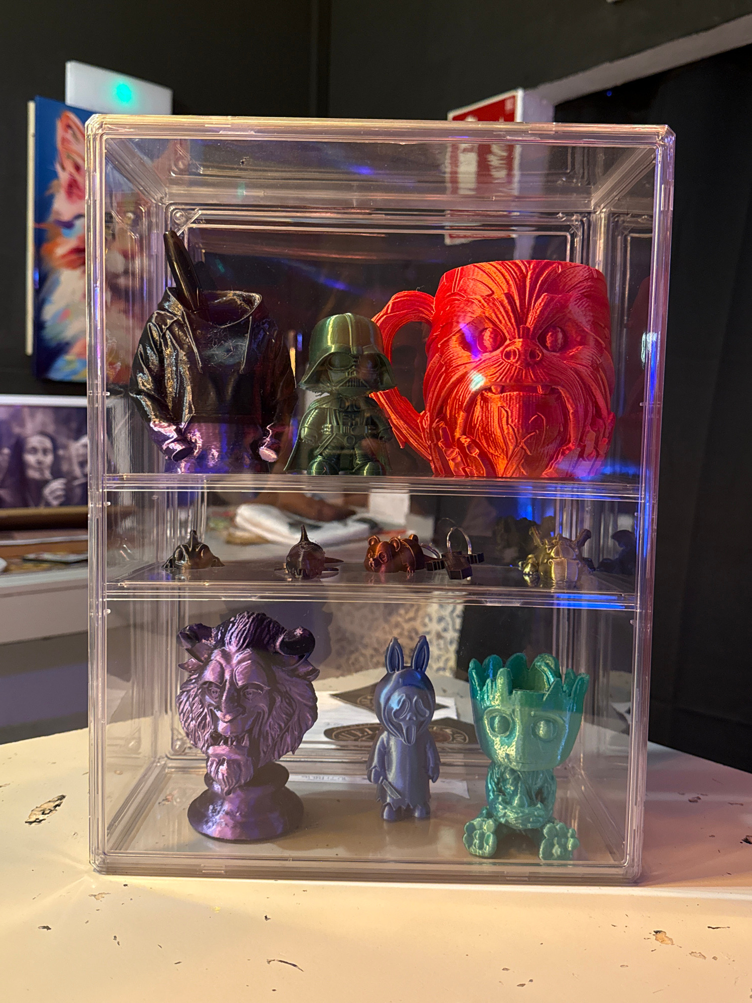 The image shows a clear acrylic display case containing an assortment of colorful figurines. The case is divided into three sections, each holding a variety of objects. From left to right, the sectionβ¦read more
