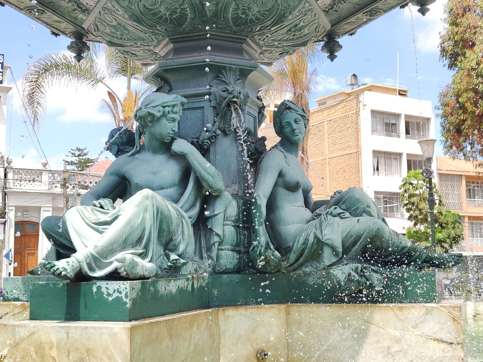 The image depicts a large, ornate fountain in the city of Tacna, Peru. The fountain features two bronze statues of seated, semi-nude figures, one male and one female, positioned on either side of a ce…read more