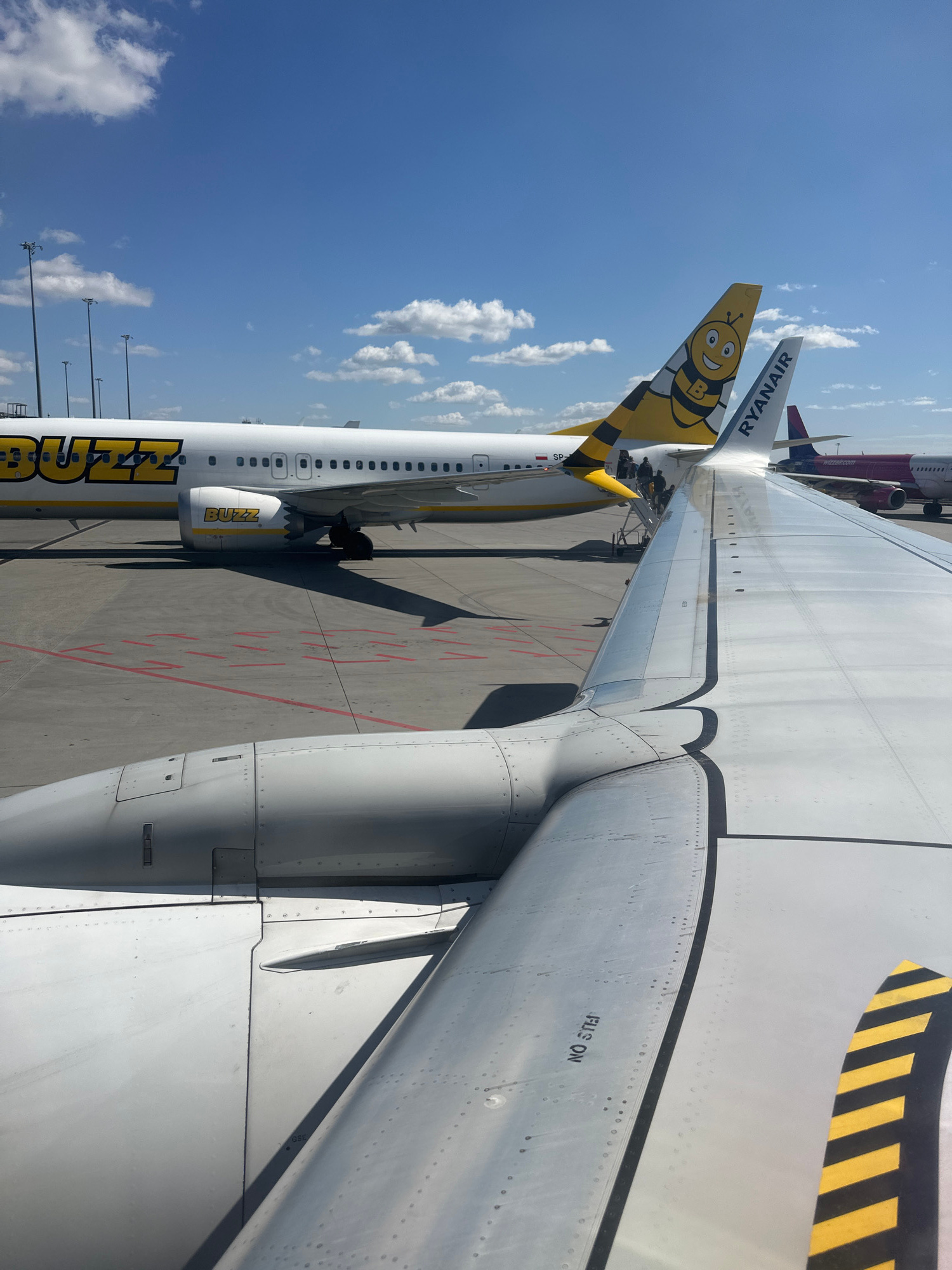 A ground-level, aerial view depicts the wing of a Ryanair airplane from inside another aircraft. The wing is grey with visible rivets and the words "FLIS ON" are printed in black letters. Next to the…read more
