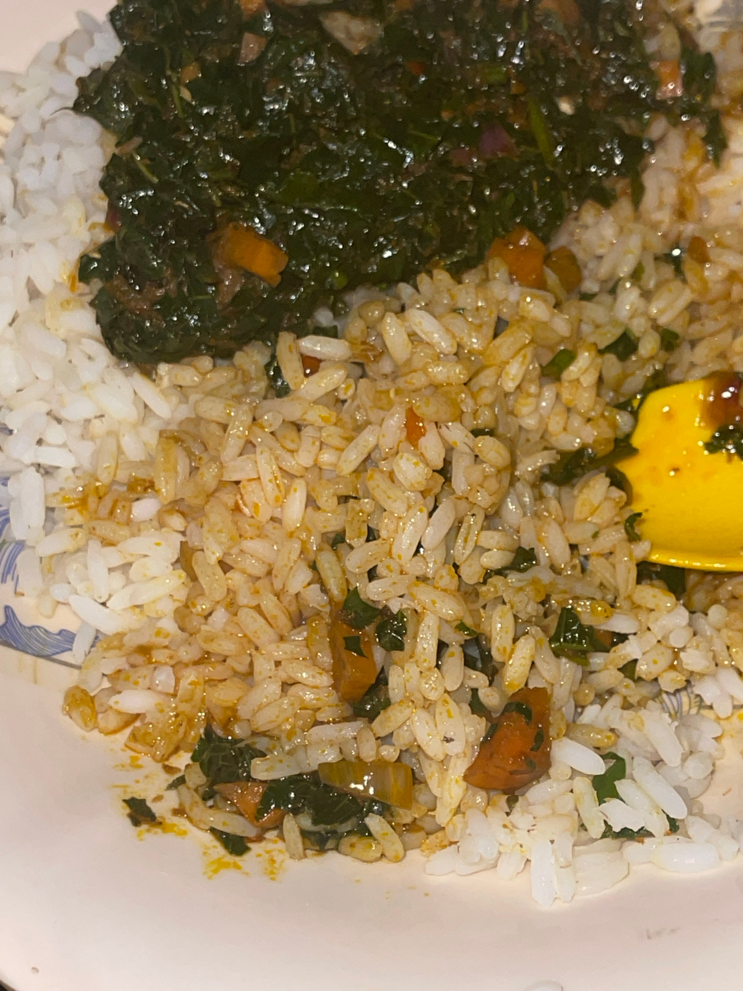 A top-down close-up shows a bowl of food, likely in Rido, Nigeria. The bowl contains white rice at the bottom, with portions of a dark green leafy vegetable stew on the left, and rice mixed with the s…read more