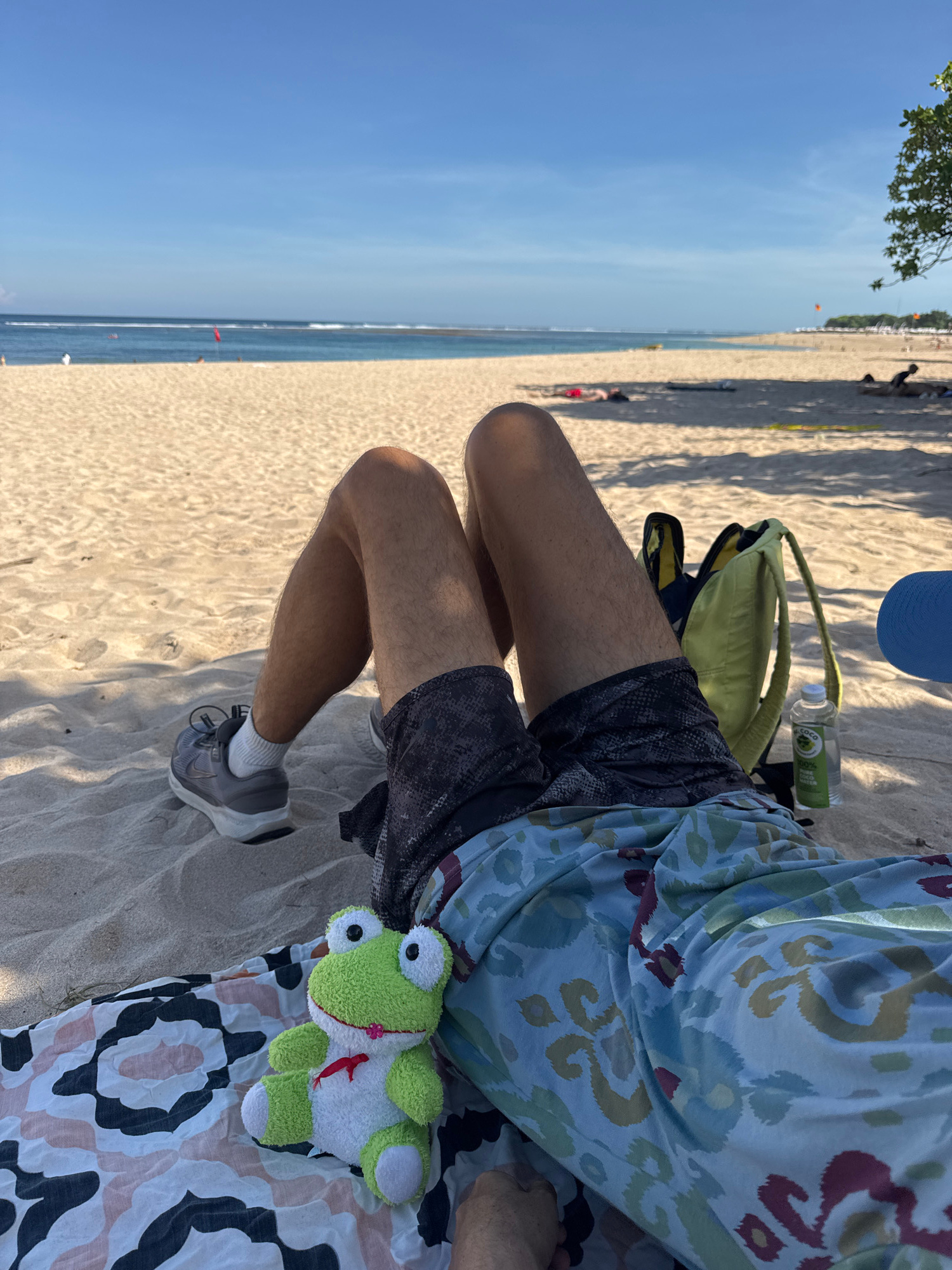 A person is sitting on a sandy beach in Kuta Selatan, Indonesia, overlooking the ocean. The person is wearing dark shorts, a patterned shirt, and gray sneakers with white socks. To the person's right,…read more