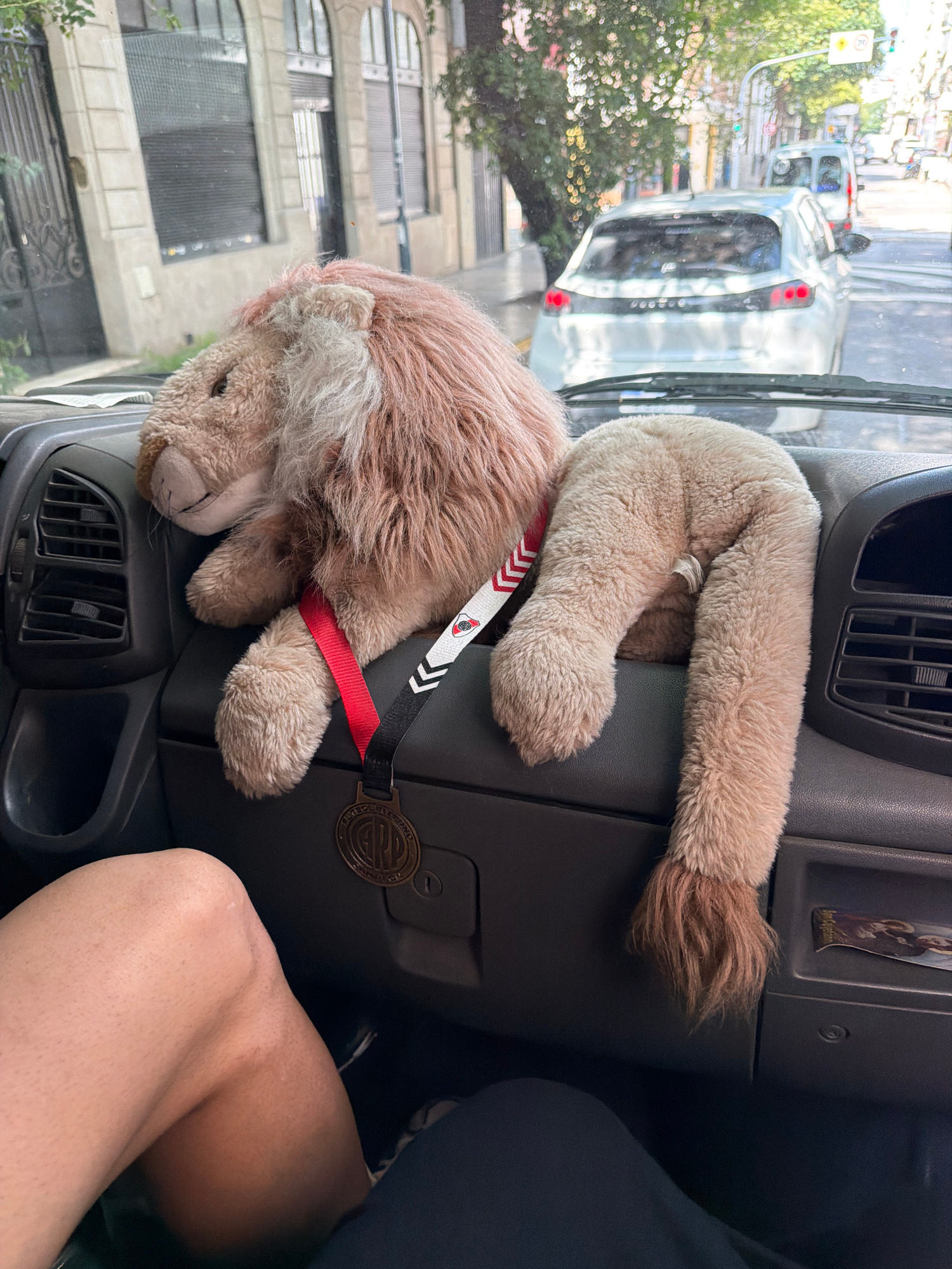 A plush lion toy with a red and black ribbon around its neck rests on the dashboard of a vehicle. The vehicle interior is grey, with air vents visible above and below the toy. Through the windshield,…read more