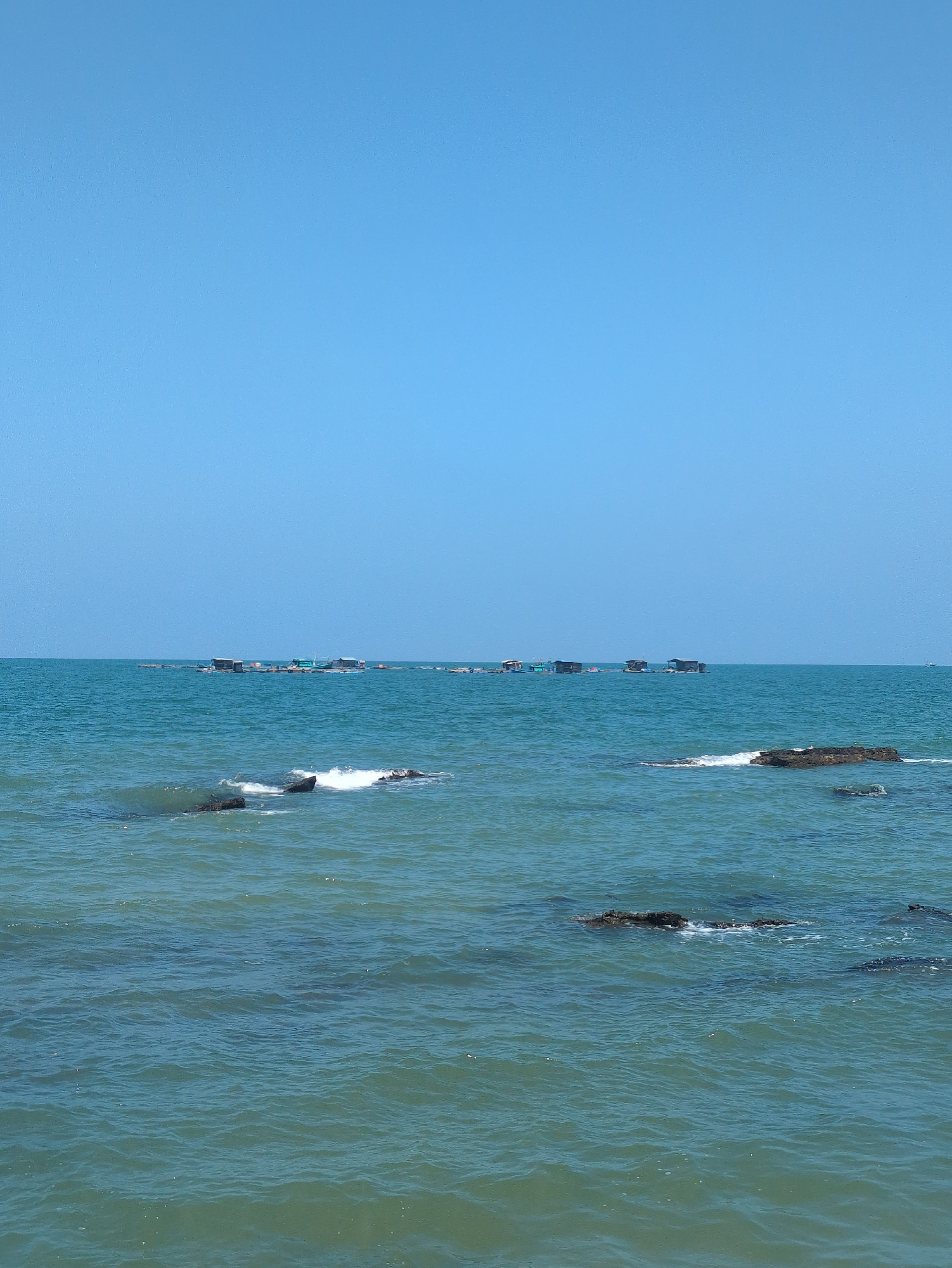 The image shows an aerial view of the sea and sky in Phú Quốc, Vietnam. The left side of the image is predominantly clear blue sky. The right side is water, with visible wave patterns and dark, presum…read more