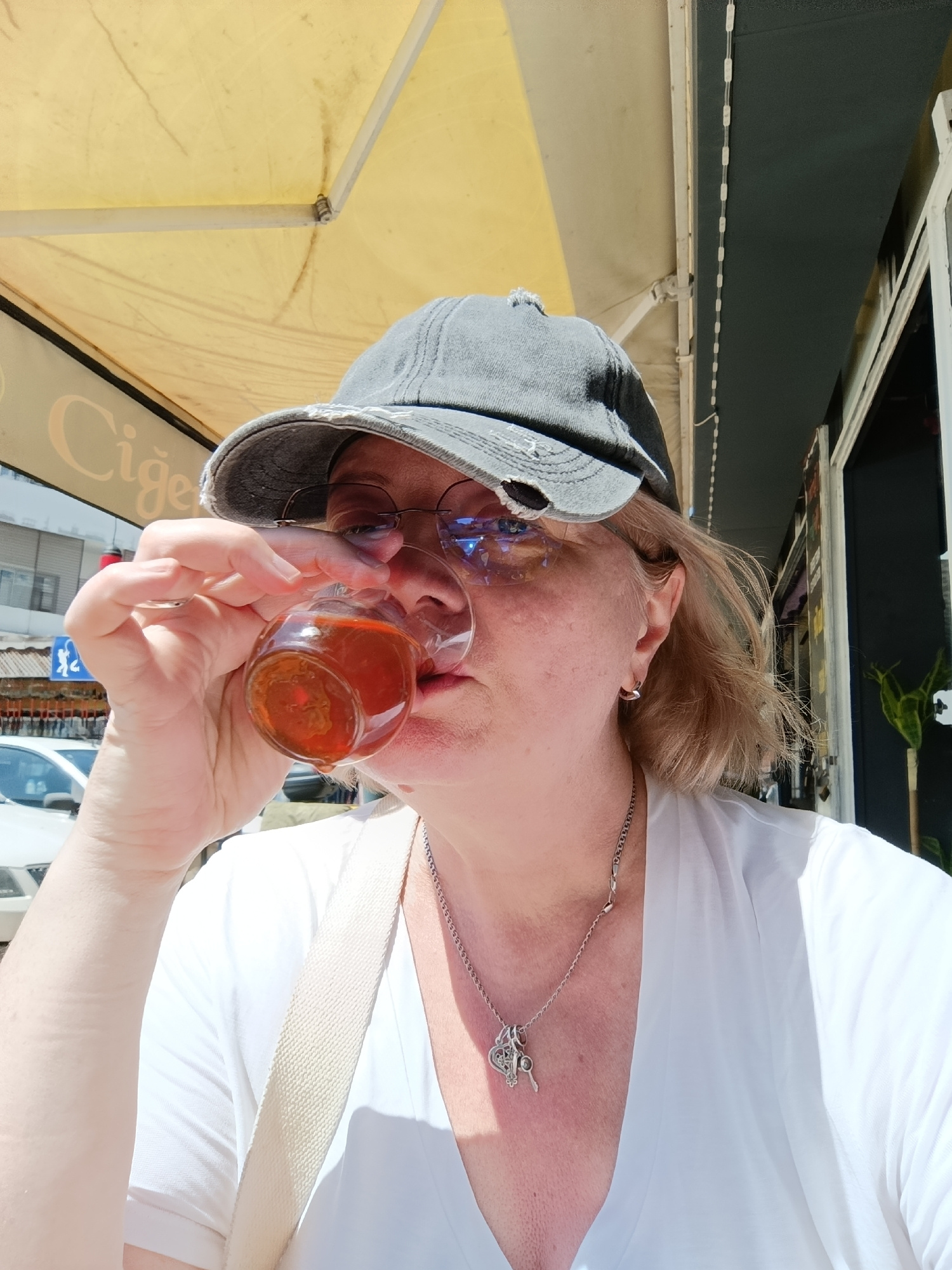 A woman is drinking a beverage in Antalya, Turkey. She has short blond hair, wears a gray baseball cap, round spectacles, and a white V-neck top with a silver chain necklace. She holds a glass contain…read more