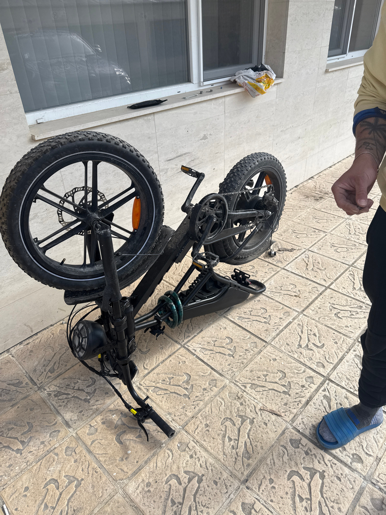 A black folding electric bicycle lies on a light-colored tiled surface outdoors. A person wearing a yellow long-sleeved shirt, black pants, and a blue slipper is standing near the bicycle. A hand with…read more