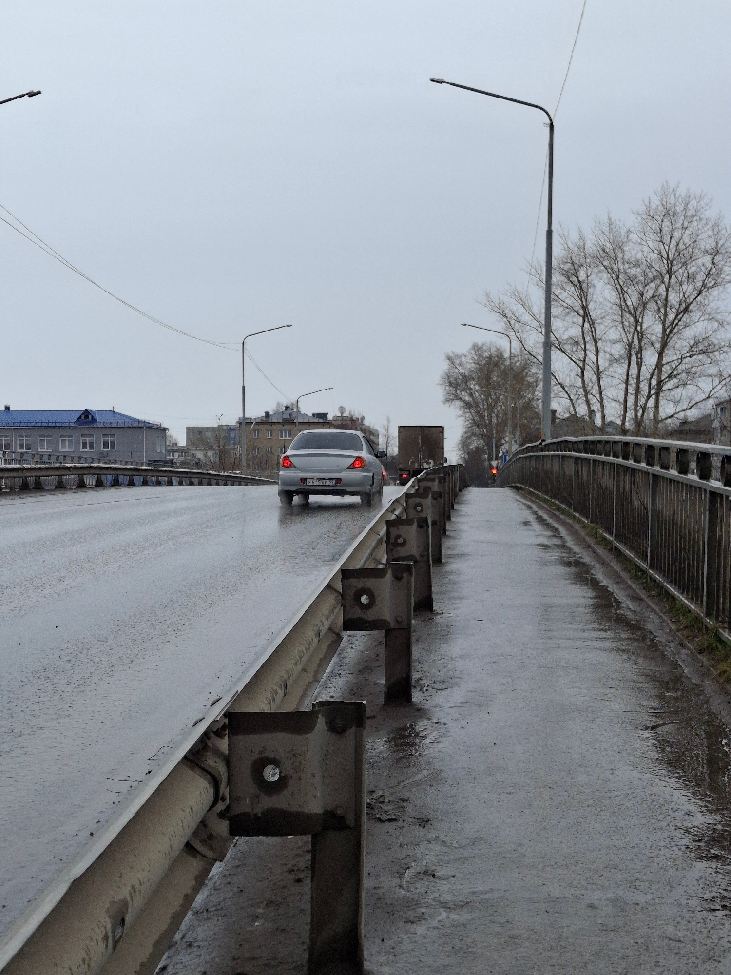 The image depicts a wet, overcast day on a bridge or overpass in what appears to be the city of Chaikovsky, Russia, based on the visible license plate. A light-colored sedan is driving on the road, with its brake lights illuminated. The road is flanked by guardrails on both sides. The guardrail closer to the camera is a combination of a concrete barrier and metal rails with visible mounting hardware. Beyond the guardrail on the far side of the road, buildings and trees are visible. Streetlights line the road, and a single red light is also visible in the distance. The overall scene suggests a gray and damp urban environment. | Open Wire