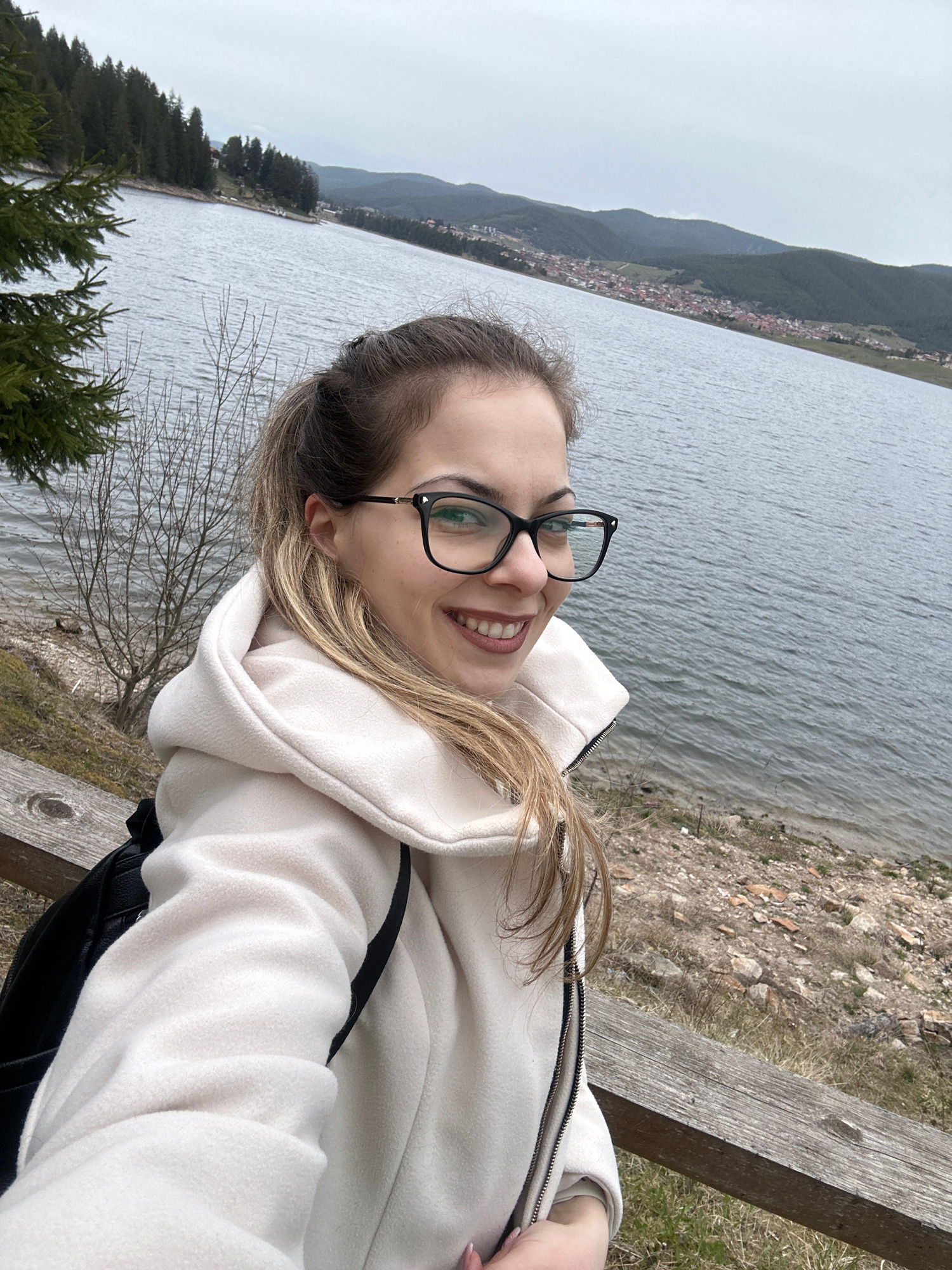 The media file presents a selfie of a young woman smiling by a large body of water, with mountains and a town in the background. The image itself is rotated 90 degrees clockwise from a typical portrai…read more